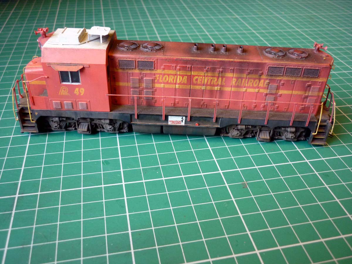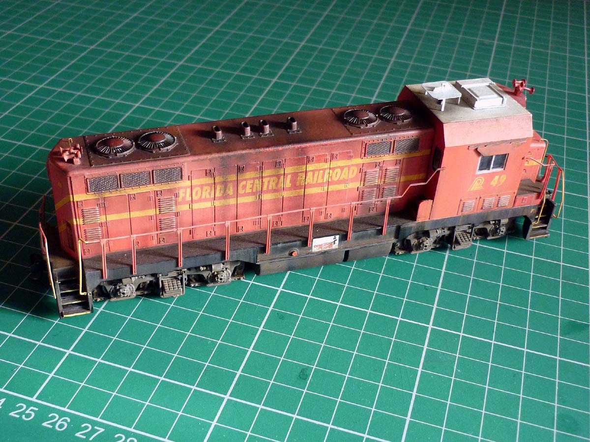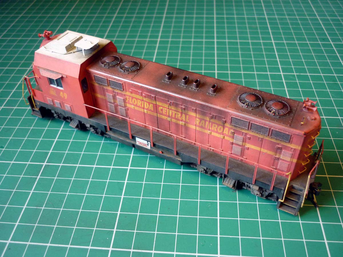 Re: CF7 Roof Weathering - Steve Williams - 12-13-2012 All completed. The dark stains down the sides seen in a lot of the prototype photos, are actually more pronounced on the model than would appear in the photos. just a case of the lighting bleaching them out a bit. : Re: CF7 Roof Weathering - nachoman - 12-13-2012 very convincing! Re: CF7 Roof Weathering - torikoos - 12-13-2012 I like it, also like the extra details like the antennae platform etc. Nice job! Koos Re: CF7 Roof Weathering - cnw1961 - 12-13-2012 Very good job Re: CF7 Roof Weathering - faraway - 12-13-2012 Steve Williams Wrote:All completed.....I watched you carefully and will try to copy your skillful weathering on my FCEN CF7 some times later. Thanks a lot for the perfect inspiration. Re: CF7 Roof Weathering - Paulman - 12-14-2012 Great results! Thanks for posting your photos. Re: CF7 Roof Weathering - Steve Williams - 12-16-2012 Thanks for the positive comments fellas. It is always nice (and useful) to get feedback, especially if positive . One has an idea about what one is trying to achieve, but there needs to be independent assessment as to how successful the attempt has or has not been. Self-delusion can be very convincing!Once again, many thanks. Re: CF7 Roof Weathering - sailormatlac - 12-21-2012 Steve, you did a wonderful job on this locomotive. What did you use exactly to fade the paint in the first step? It's quite effective. Matt Re: CF7 Roof Weathering - Steve Williams - 12-23-2012 sailormatlac Wrote:Steve, you did a wonderful job on this locomotive. What did you use exactly to fade the paint in the first step? It's quite effective. Thanks Matt. I just gave it a wash of pale cream. It was Humbrol 121 which is 'Matt Pale stone'. Then washed most of it off with a flat brush and white spirit. it later got another wash of Precision 'Dirty Black , again with most of it removed, but it remained in the detail areas and the paleness of the red still came through the darker wash. The sooty stains were done with weathering powders. Re: CF7 Roof Weathering - dwight77 - 12-24-2012 Hi Steve: I go between Ft. Myers, Fl and Orlando periodically and noticed the Florida Central locos just south of Winter Haven in an industrial area. I was finally able to take a picture....it wasn't what I had hoped for as in previous trips they had two locomotives out near the highway where great pictures could be taken. I will be going back in about 10 days and will try to take some more pics. But what you see and what you are modeling are very very very close.....you are doing a great job. dwight77