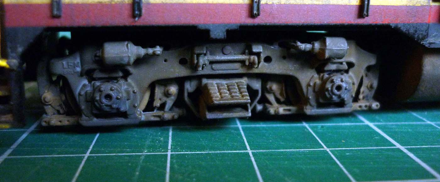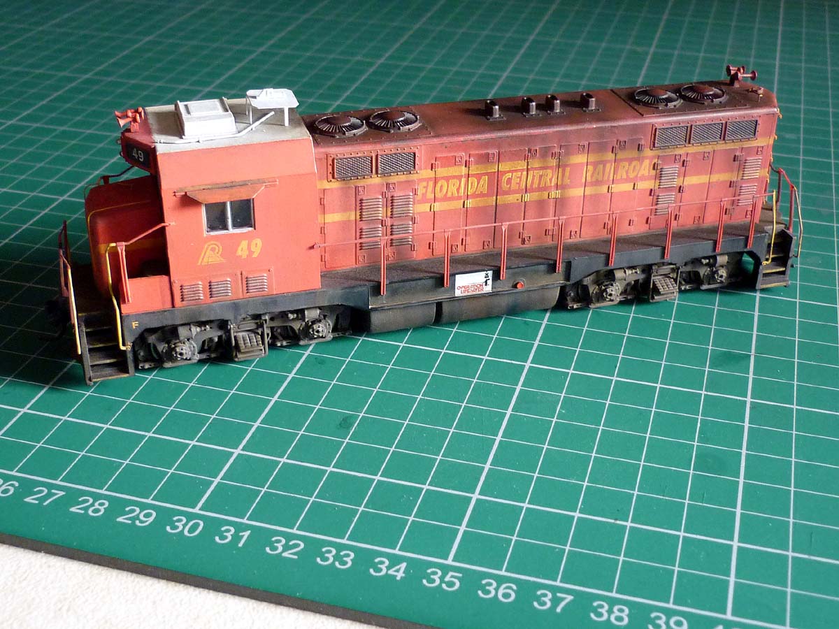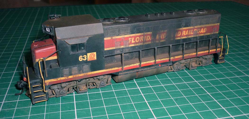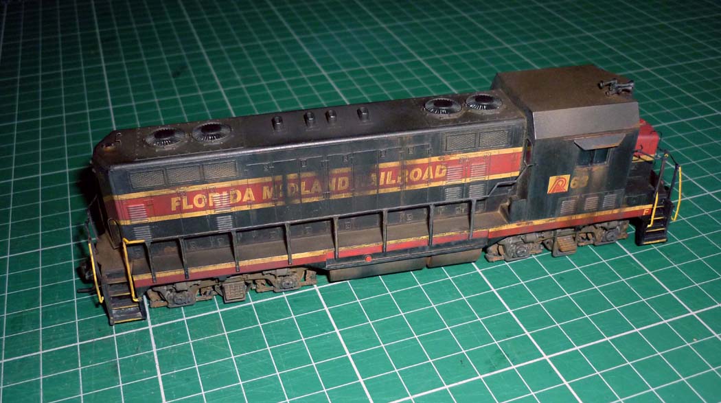 Re: CF7 Roof Weathering - Steve Williams - 12-13-2012 All completed. The dark stains down the sides seen in a lot of the prototype photos, are actually more pronounced on the model than would appear in the photos. just a case of the lighting bleaching them out a bit. : Re: CF7 Roof Weathering - nachoman - 12-13-2012 very convincing! Re: CF7 Roof Weathering - torikoos - 12-13-2012 I like it, also like the extra details like the antennae platform etc. Nice job! Koos Re: CF7 Roof Weathering - cnw1961 - 12-13-2012 Very good job Re: CF7 Roof Weathering - faraway - 12-13-2012 Steve Williams Wrote:All completed.....I watched you carefully and will try to copy your skillful weathering on my FCEN CF7 some times later. Thanks a lot for the perfect inspiration. Re: CF7 Roof Weathering - Paulman - 12-14-2012 Great results! Thanks for posting your photos. Re: CF7 Roof Weathering - Steve Williams - 12-16-2012 Thanks for the positive comments fellas. It is always nice (and useful) to get feedback, especially if positive . One has an idea about what one is trying to achieve, but there needs to be independent assessment as to how successful the attempt has or has not been. Self-delusion can be very convincing!Once again, many thanks. Re: CF7 Roof Weathering - sailormatlac - 12-21-2012 Steve, you did a wonderful job on this locomotive. What did you use exactly to fade the paint in the first step? It's quite effective. Matt Re: CF7 Roof Weathering - Steve Williams - 12-23-2012 sailormatlac Wrote:Steve, you did a wonderful job on this locomotive. What did you use exactly to fade the paint in the first step? It's quite effective. Thanks Matt. I just gave it a wash of pale cream. It was Humbrol 121 which is 'Matt Pale stone'. Then washed most of it off with a flat brush and white spirit. it later got another wash of Precision 'Dirty Black , again with most of it removed, but it remained in the detail areas and the paleness of the red still came through the darker wash. The sooty stains were done with weathering powders. Re: CF7 Roof Weathering - dwight77 - 12-24-2012 Hi Steve: I go between Ft. Myers, Fl and Orlando periodically and noticed the Florida Central locos just south of Winter Haven in an industrial area. I was finally able to take a picture....it wasn't what I had hoped for as in previous trips they had two locomotives out near the highway where great pictures could be taken. I will be going back in about 10 days and will try to take some more pics. But what you see and what you are modeling are very very very close.....you are doing a great job. dwight77