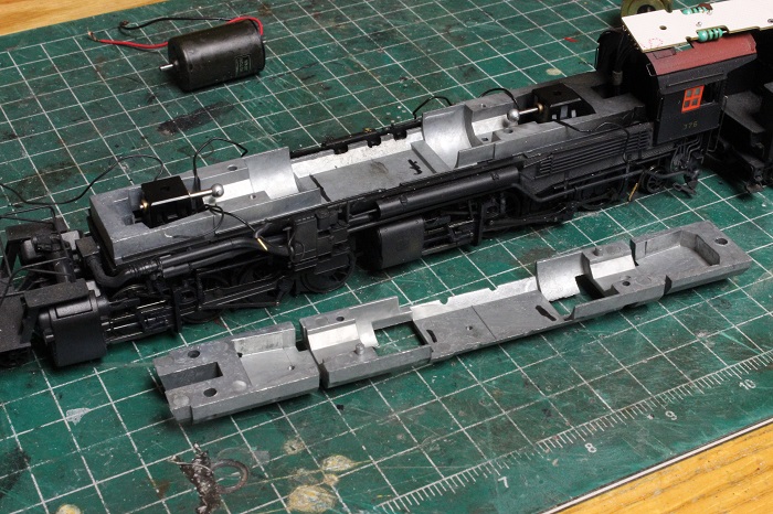 But now..... I have located the a motor the right size to fit inside the boiler weight. I did have to drill out the P2K fly wheels to fit the new motor shafts and solder on new leads to get power from the PC board to the motor.
