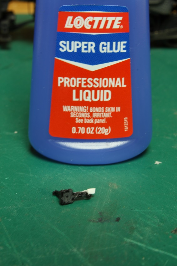 After some searching I found out that Walthers no longer offers any parts for this loco. My next move is to try to repair the one I have. I glued some thin styrene to the back of the crank and a filler piece to where the crank is broken. I will give it at least a day to dry before I drill it out and start to shape it into the missing section. I have found in the past that this brand of CA works nicely on this slippery plastic that they used on this part. I think that it's Delran.