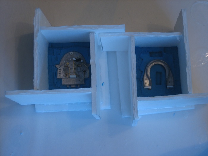 As per the instructions I formed some of the" KLEEN KLAY " into a rectangle and pressed the masters into it. Then with some $ store foam board I hot glued a box around each one, and tamped down the edges of the clay to make a good seal.