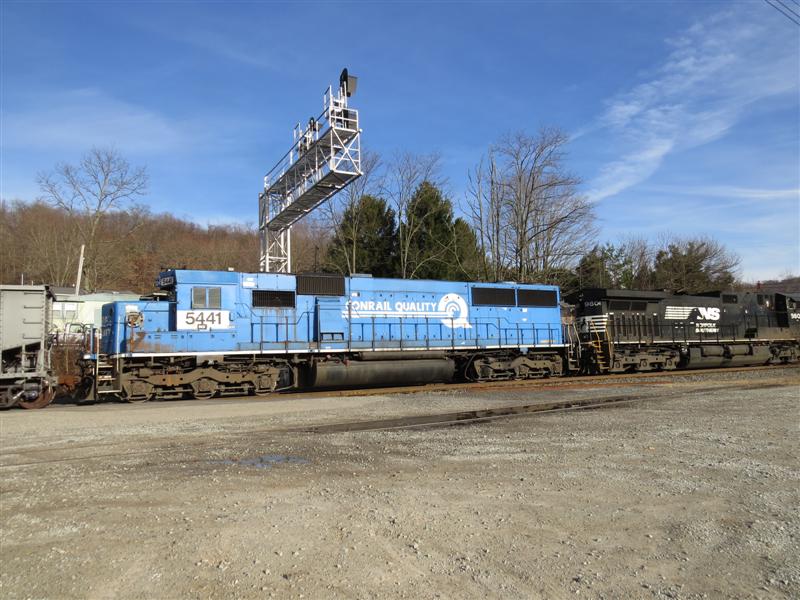 Ex Conrail SD50 on a coal train East on the NS Conemaugh line through Saltsburg,Pennsylvania today(12-6-12) around 12;45pm.
