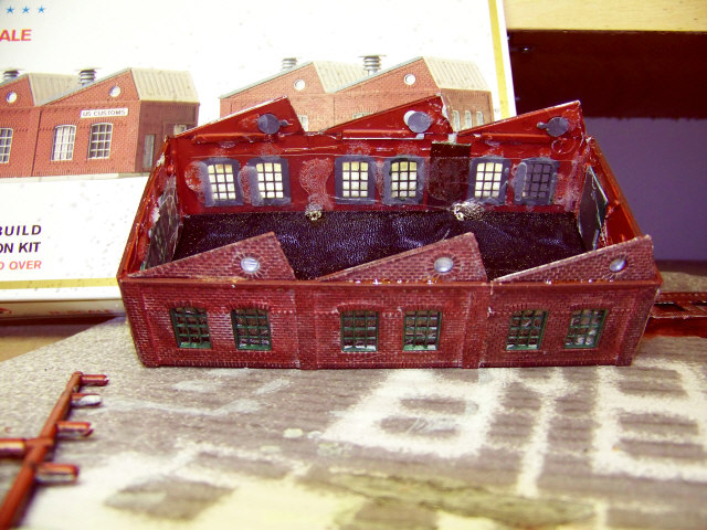 The main building wasn't difficult. I took the parts and painted them an off-white before dry brushing them with a brick color. I did a preliminary ink wash before separating them. Since I couldn't use the base, I made a temporary insert in order to keep the walls square before adding the roof.