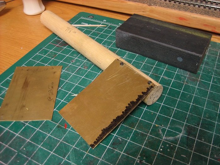 I carefully lined up the square end of the dowel with the long side of the brass sheet, drilled holes into the brass, and with small wood screws fastened it in place. all the while making that it all remained square. This will make it easier to attach the boiler front latter.