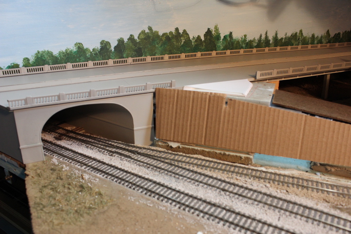 The cardboard is where the retaining wall needs to be. I want to use a wall made from concrete castings similar to modern ties. I'll post a pic next post. I'm hoping someone knows of some available item or I'll need to scratchbuild a half dozen then make molds and start casting. If I need to go that route I'll need some referance material! The white styrene piece is the on/off ramp and will be concrete like the highway. I will switch to macadam beyond that, where the masonite is filling in for the road surface.