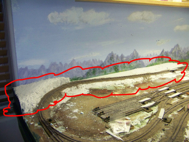 but we'll put that aside for now and concentrate on one area of my layout. I would like to take the area that I have circled in this photo, and finish it up. I had planned on putting in a few buildings to create an edge-of-town cityscape, but since I elevated the tracks there, it might look a bit more natural to finish it mostly like the edge of a mountain scene. I'm not sure just how I plan on doing it, but my challenge is to do it only with the materials I have on hand. :o No buying anything including kits, plaster, foam, paint and landscape or other building material... not a thing.