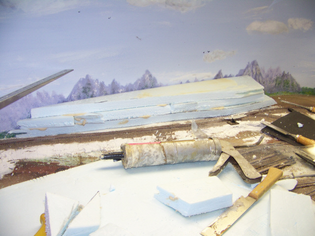 Alright, it may appear that I have given up, but in fact I have made a bit of progress. I'm going ahead with the plan to put a tree-lined hill in this area. This means that I'll have to redo some of the backdrop in behind the hill as well, which is fine since I think that needs some improvement anyway. Here's the first steps in the process, cutting and gluing the foam. No biggie, but every journey starts with the first tiny step.