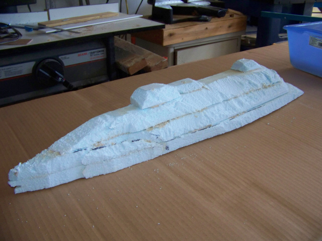 OK, yesterday I did make a bit more progress. I have not secured the hill to my layout yet since I plan on working on it in my garage since it's easier to do it and it does appear that I can just about finish it before gluing it in place. It's just a whole lot easier to work on this way. BTW, my wife thinks it looks like one half of a Star War's Battle Cruiser. :o Maybe it won't once I get some trees planted.