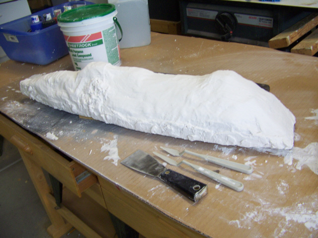 The next step was to coat the plaster with joint compound. I thinned it out and smoothed it over with my hands, and used it out of the tub to sculptured it to make the rock shapes. I normally use only the tools shown when doing rock formations, and find I can rework the compound over a few hours time as it begins to harden to get the shapes I want: