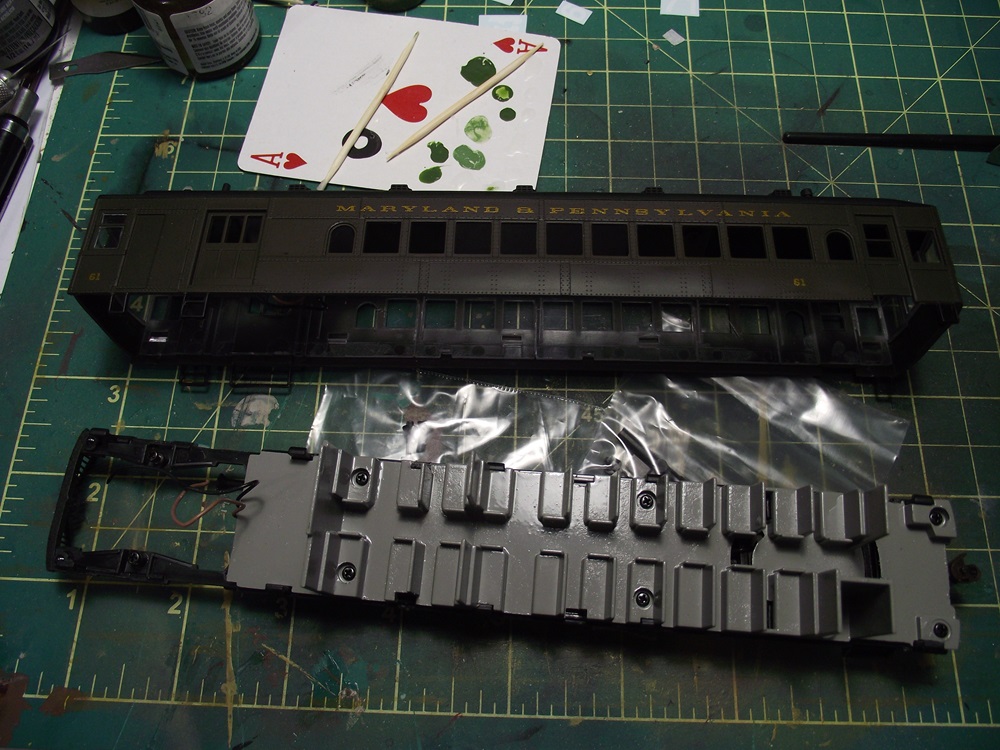 This was a purchased car but the previous owner glued the floor on and used Accurails little plastic truck pins, so I tapped the holes and replaced the pins with screws so the trucks could be more easily removed.