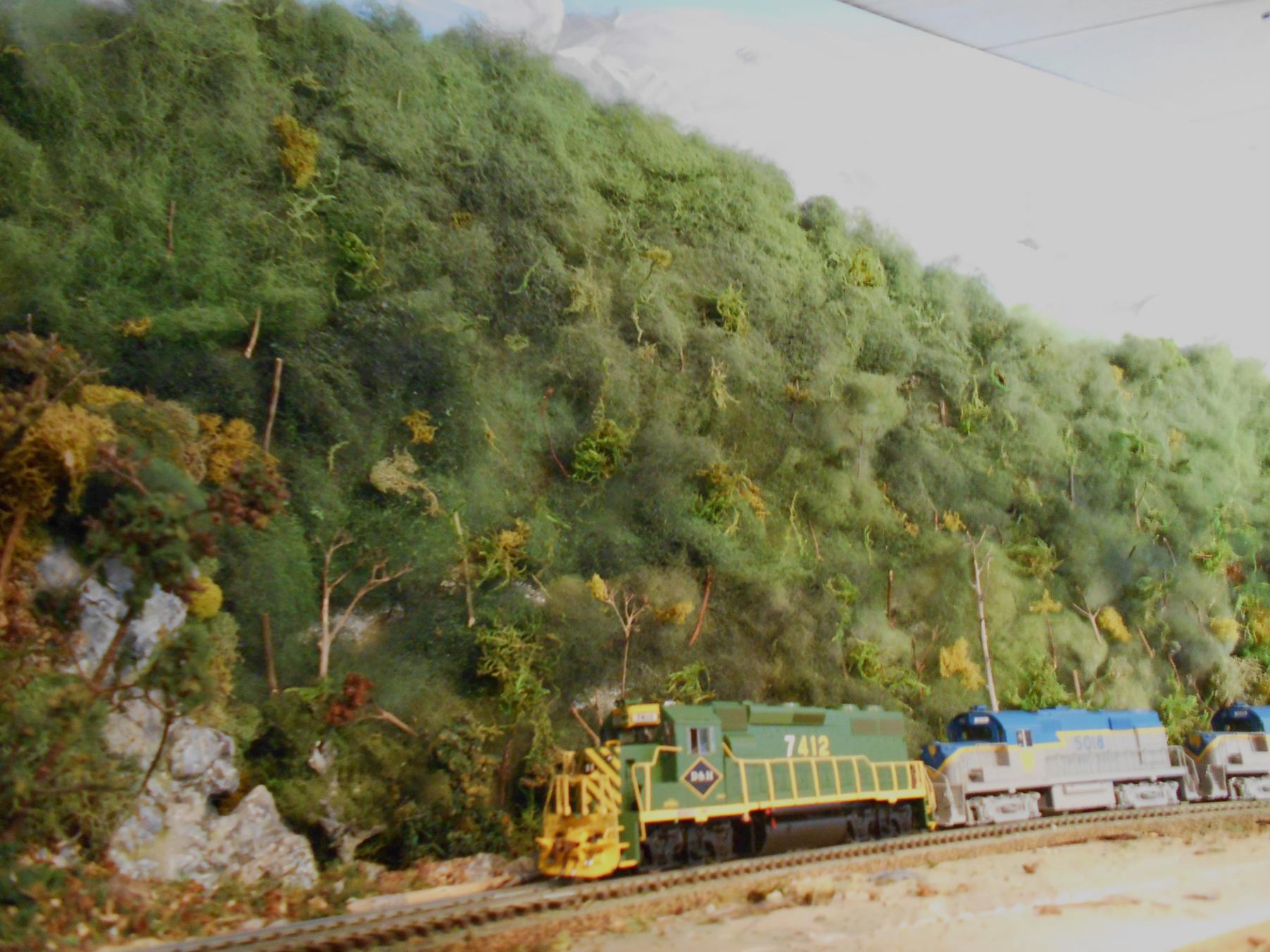 Here's a great example. I actually fabricated ZERO trees to create most of this mountain, and the distance between the track and the backdrop here is no more than 4 inches. Note that the colors change more at the bottom of the moutain and the trunks are not visible other than at the base of the mountain. I got this idea from a short article in Model Railroader from an issue in the early 80's...