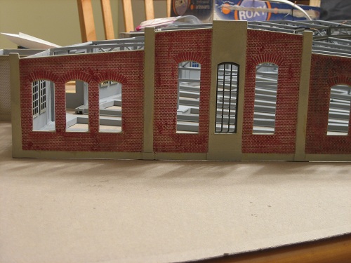 new project - e-paw - 04-22-2010 My first plan was to air brush the brick work, but than I though, "what if I dry brush the brick and touch up the moder with some washes." So I gave it a shot on a section that will be out of sight to see how it would turn out. That's the finished section. What do you think? I would like some opinions on this technique. Re: new project - doctorwayne - 04-22-2010 Steve, I really like your results: that brickwork looks excellent. However, I don't think that it's the right one to use with a concrete-framed building. All of the ones I've seen (mostly factories) used a mono-coloured brick, although the one shown below does seem to have some buff-coloured bricks mixed in - the area where it's located is noted for bricks of that colour, as is evident from the second picture, taken at the same site. ![]() ![]() Unfortunately, I don't have any photos of the dozens that were once located in my hometown of Hamilton, Ontario - many have been torn down, and some have been painted over, but all the ones that I recall used bricks of the same red-orange colour, and I've seen the same shade predominating throughout Ontario and the Northeastern U.S., too. However, I suspect that you may have a specific prototype in mind, one that inspired you to go with the type of brick you show, so, by all means, use it. Wayne Re: new project - Gary S - 04-22-2010 It definitely looks good though! I like it alot. new project - e-paw - 04-23-2010 Thanks Wayne. I don't really have a single prototype in mind, The idea came from a Reading roundhouse near Bethlehem PA. It's construction is a concrete frame with concrete block walls. I just subsided the block with brick. The brick pattern comes from my uncles old home in Somerset NJ. When I asked him why some bricks were darker than others He said, " There just dirty. I'll get you a toothbrush and we'll clean them up, one at a time". I think I was about 5 years old at the time and thought I was in for some hard work. I kind of like the look and think I'll use it as the company standard. Here's a step by step of the process. It's pretty simple. The first step is to dry brush the brick . I used a brick red color from my wife's craft pants. Then I touched up the moder lines with a wash of Aged Concrete and D&H Gray. The last step is to paint some of the bricks Roof brown and to lightly dry brush Grimy Black all over the wall. I also installed the windows to see how it looks. Re: new project - Gary S - 04-23-2010 e-paw Wrote:I also installed the windows to see how it looks. Well, it looks awesome, that's how it looks! And thanks for the tutorial on the brick. Looks pretty easy! Re: new project - doctorwayne - 04-24-2010 e-paw Wrote:The brick pattern comes from my uncles old home in Somerset NJ. That's possibly why it "didn't look right" to me, as my parents' last home was built with the same brick. I agree with Gary, though: it looks great, and the idea of using it as a company standard is a good one. Wayne Re: new project - cn nutbar - 04-24-2010 Nice job Steve---looking forward to the fininshed project Re: new project - Sumpter250 - 04-24-2010 As a general rule, bricks are made locally, from local clays. This doesn't rule out color variations that can be anywhere from slight to pronounced. That said, I like how you've added the color variations, and how you colored the mortar. On older buildings there could actually be areas of "newer looking mortar" where tuck-pointing has been done, or where a newer extension has been added. I've always liked the look of buildings that have "been growed". Re: new project - ocalicreek - 04-24-2010 Looks great! Now git yerself yer OWN craft paints! When I accompany my wife to JoAnn's or Michael's, if she doesn't use the 40 or 50% off coupon and I've got the spare cash, I'll pick out a color or two that looks interesting. Before long a person builds up a nice collection of these little bottles. Sometimes they're even on sale! Nice choice to use the technique you did...it's one of my favorites - as long as the mortar lines have enough depth and the brush stays dry enough. Helps if the bricks have good definition, too. Galen Re: new project - nachoman - 04-24-2010 Browsing through this thread it appears I am not the first person to overlook this one for awhile. Excellent work here, very excellent. Now I better bookmark this thread, because I may borrow some of your ideas later - especially those oil storage tanks . They have just the look I am after.