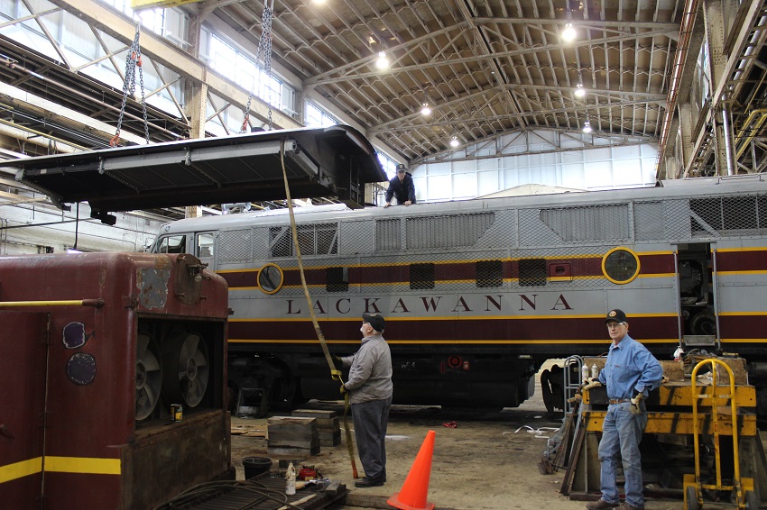 Re: 1 : 1 scale modeling - Mr Fixit - 04-02-2016 So the gaskets are just a thin wide strip of cold rolled steel with slots for the exhaust stack bolts to go through? Is that correct? Mark Re: 1 : 1 scale modeling - ngauger - 04-02-2016 Nice!!!! Re: 1 : 1 scale modeling - e-paw - 04-02-2016 Yes Mr Fixit, That is true for the gaskets on the top of the block ( the yellow ones ). I should have noted that the smaller set of openings, toward the front of the engine, is an inlet for engine coolant. That also has the same kind of gasket as the exhaust . All of those fixtures are held in place with brass nuts. The top deck gaskets are of a "wet" type. They are composed of a fibrous, paper like material that soaks in a small amount of oil and swells to fill in any small gaps. Not many pics of me doing anything here,,, I'm normally on the other side of the camera. but, I do show up in this Richard Jahn photo. Re: 1 : 1 scale modeling - e-paw - 04-23-2016 With the new radiators back in and the prime mover put back together it was time to put the top back on. Here's a shot from the inside of what the new cooling system looks like. All the plumbing will still need to be connected,,, but that's for next week. The conduits were reinstalled into the fan control cabinet., and all the wiring terminated on to it's correct binding post. Then it was time to step outside for a little breather and watch #26 take out the yard shuttle. Re: 1 : 1 scale modeling - e-paw - 04-23-2016 One of the upgrades that is being done while we are doing this is to remove the old "Oil Bath" type air filter housings that are no longer in service and attach the paper filter holders directly to the blowers. The oil bath system on the left, mounts on top of the blower by the round flange on it's bottom (it's upside down in this pic). Then the paper filter bracket on the right, attaches on the open end on the left. After all the plumbing for the cooling system is reassembled the new improved air filters will be mounted. Re: 1 : 1 scale modeling - Mr Fixit - 04-23-2016 e-paw Wrote:Yes Mr Fixit, That is true for the gaskets on the top of the block ( the yellow ones ). I should have noted that the smaller set of openings, toward the front of the engine, is an inlet for engine coolant. That also has the same kind of gasket as the exhaust . All of those fixtures are held in place with brass nuts. The top deck gaskets are of a "wet" type. They are composed of a fibrous, paper like material that soaks in a small amount of oil and swells to fill in any small gaps. Ah, e-paw, which one in the photo is you? Can I just say from a workshop OH&S rep. point of view, I am not crazy about the photo of you guys working on top of the roof without any means of fall protection, either a harness system, building a temporary timber or steel handrail on both sides and or placing a mobile scaffold against both sides of the locomotive. Now before we get into a heated debate about the issue, remember it is a long way down to that hard concrete floor, which like Gravity, is very unforgiving. A serious accident or death can and will result in a whole lot of trouble, think officialdom, investigations, even inquests, that no body needs and which a volunteer organisation is generally not well placed to deal with, and may well not survive. Given that you will have to repeat this process next year, it is well worth investing some time and energy in solving this problem before the next work cycle. I dont wish to be seen as a Safety Nazi, as I would rather raise this issue friend to friend, before it becomes a tale of woe. I will give some thought to a suggested solution or two for you as one friend to another. Please just take some little time with your workmates to discuss and properly solve this sort of issue so that you and we via you wonderful blog posts can continue to enjoy the 1 : 1 scale modelling that you do. Mark Re: 1 : 1 scale modeling - e-paw - 04-30-2016 This mornings work session was very productive... First off we installed the newly finished air filter brackets. The plumbing connections were assembled from the water outlet on the prime mover to the radiators. The forward fan was reinstalled ,, It was removed in order to gain access to the top bolts on the radiators. The batteries were also charged, and with the cylinder cocks open and the fuel pump shut off we pre-lubed the engine and rotated her a few times . We also checked out some of the firebox grates and hangers for the Boston and Main steamer that were being inspected. The entire Firebox was X-rayed and Magna fluxed, we should hear back on the results soon. While all of this was going on Little #26 was outside putting on the best show she could. Re: 1 : 1 scale modeling - e-paw - 06-18-2016 Tomorrow 664 will lead the father's day excursion to Moscow and back so today was a day of last minute fixes and prep work for the trip. Last week she developed a radiator leak on the engineer's side , the side that we didn't replace over last winter. We were able to loosen up a few of the bolts and seal her up with some formagasket. The pink stains are from the water treatment, it makes it easy to locate leaks in the cooling system. This repair is only temporary, we will have a new set to replace the 70 plus year old ones in a few weeks. Another project was to replace the glass in the mirrors, these were also original to the locomotive. This shot shows the new glass in the frames with the old mirrors next to them. We then took her out for a shakedown run throughout the yard limits. With no leaks and all systems working as they should we took her back to the diesel shop for a bath. Re: 1 : 1 scale modeling - e-paw - 07-16-2016 Lots going on but only one pic for now.. We just took delivery of a new compressor / compressor coupling from a CF-7 that was going under the torch. The coupling will be used on 663 to get her back up and running, and the compressor , or parts of, will go into the B-unit. Speaking of t