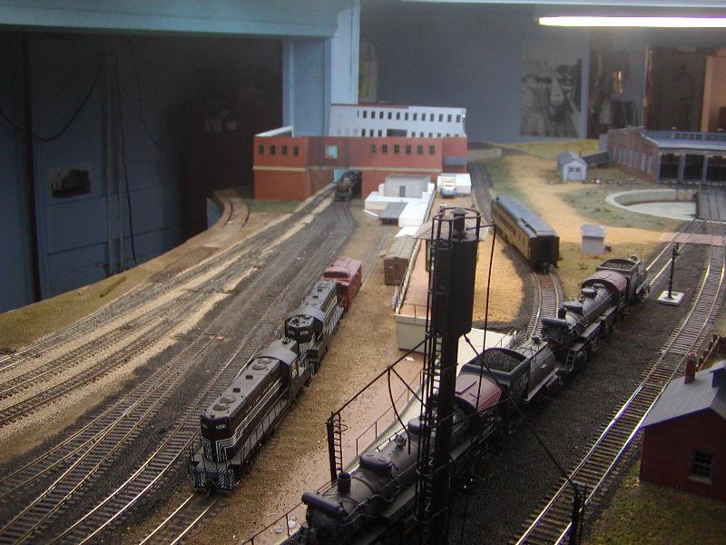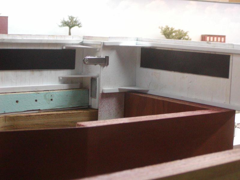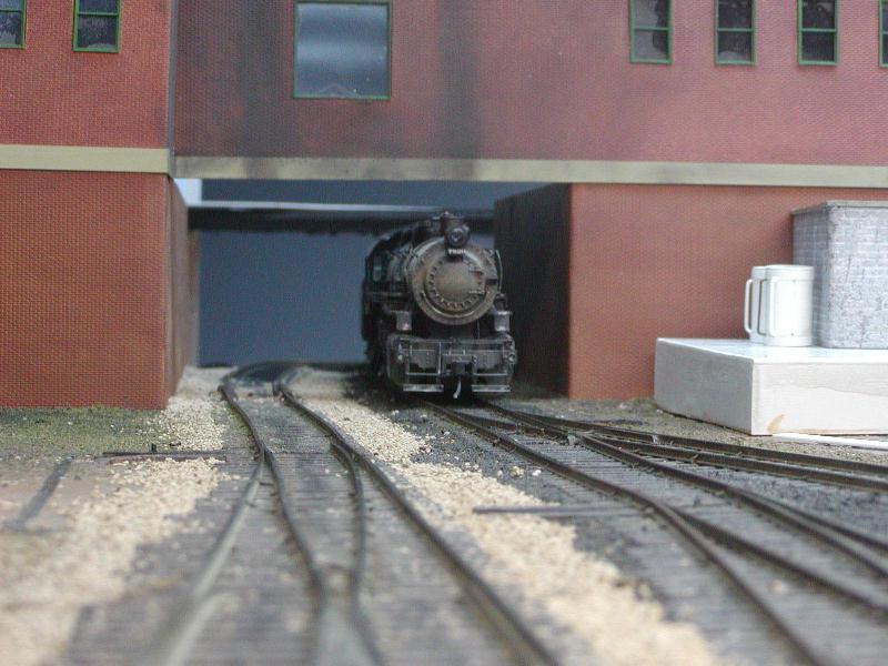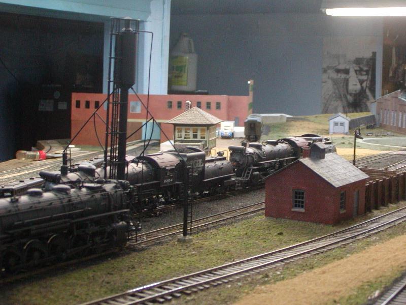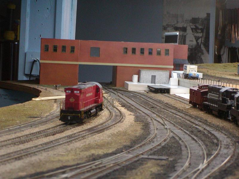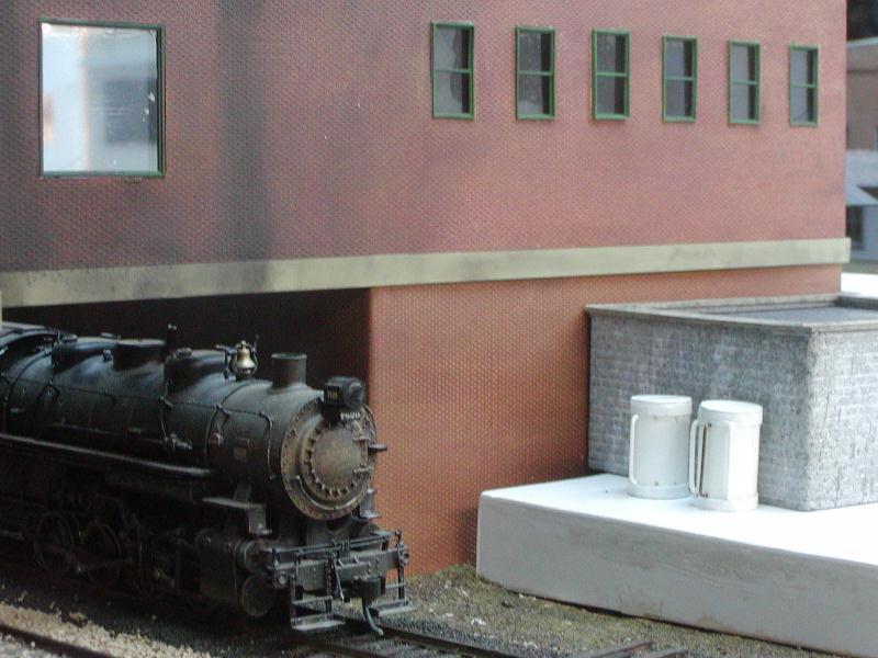 Re: An engine servicing facility for the JGL - eightyeightfan1 - 08-11-2009 This is turning out to be a sweet project. Re: An engine servicing facility for the JGL - jglfan - 08-12-2009 Thanks 88. Well, I went downstairs this morning and trimmed back that sill, and put the windows in that wall while I was at it. I also built a platform. A little tweaking is still needed to get the tops of the walls to match in height, but that is no problem. Things are looking a lot better already! In case anyone may be interested, here is how I am attaching the walls together, behind the scenes. Once I am satisfied with all the walls, I will cement them in place, using clips like the one in the photo to hold them together. I'm thinking of using epoxy, which as Doc Wayne pointed out earlier in this thread, doesn't stick to styrene real well. In this case, that will be good. It gives me adaquate set up time to get things alined and will allow me to break it apart if needed. BTW, this is the side facing where I have to work from, to see the outside of the walls as in the photos, I have to walk around to the aisle on the other side of the peninsula, and view from several feet away. This view just shows one angle of how the scene is shaping up Re: An engine servicing facility for the JGL - jglfan - 08-12-2009 Here is a pic with the next piece of the puzzle sitting in place. I need to run some errands (and look for a job!) so it will be later before I can get to it. In the previous photo, you see a large window which I have not blacked out like I have the others. This because I want to be able to take pics as though they were looking out of the Presidents office. Well, the clear styrene in teh window really "softens" the image so I'm not sure how viable this option will be. But here is how it looks. Just one more, a "scenery" shot giving an idea of the whole area. The tracks beneath the building will appear much darker once a roof is in place on the bldg. Re: An engine servicing facility for the JGL - nachoman - 08-12-2009 actually, that "through the window" photo looks kinda real (minus the fluorescent fixtures). Taking photos through 1:1 windows usually doesn't work out well, either. Re: An engine servicing facility for the JGL - doctorwayne - 08-12-2009 Lookin' good, Gary. ), it might give a clearer view. Another way to get shots of inaccessible areas is to place your camera on the layout, aim in the general direction you want, and hope for the best. With a digital camera, at least you're not wasting film. This area, as seen from the aisle: [album]1233[/album] and as seen from the layout: [album]1234[/album] or this scene, from the aisle: [album]391[/album] or looking out, towards the aisle: [album]981[/album] and the same area, as viewed from on the layout: [album]382[/album] Wayne Re: An engine servicing facility for the JGL - e-paw - 08-12-2009 Looks good, I wonder if you could use the glass from a microscope slide for the window glass. I would think that it would be clearer because they stay clear under the magnification of the microscope. I hope the same stays true for the camera lense, but now as I think of it the haze is kind of realistic. I've seen that effect in a few real photos. Re: An engine servicing facility for the JGL - Russ Bellinis - 08-13-2009 You could also make the "glass" in that window removable for picture taking. Re: An engine servicing facility for the JGL - jglfan - 08-13-2009 Good point Kevin. Wayne, I'm not sure where I would get a piece of thin real glass, microscope glass as Steve suggested would not be large enough, (I think) the window being not quite square, but just over 1" in both dimensions. But what I've been thinking is along the lines of what Russ suggested, I may use some channel on the inside of the wall, so I can slide the window out if wanted. The roof will be removable, and a shelf will be in place inside to sit the camera on. If I ever attempt to learn Photoshop or an equivalent program, I could get rid of the lights (even a slight downward tilt to the camera body and some editing would help) and add smoke, etc. I bet the softening effect could be used to good effect on headlights. I've done some work today on the remaining first floor walls, am now building a canopy of sorts to keep Eddie (the President) dry during rain when he needs to board his private car. Once that is painted and mounted over the door, I can fasten the two walls you've seen so far and get to worl aligning the concrete sills for the next sections. I'm getting there! Re: An engine servicing facility for the JGL - jglfan - 08-14-2009 Here are a few more pics of progress. Essentially I am ready to glue the walls shown together and to the base. I can then design and make the roof and the one story rear wall. However, I will be waiting over the weekend, so I can still bring any wall section to my workbench for finishing touches as I deem required. For instance, that canopy is weathered, but I can't tell from normal viewing distance. I may weather it more, can't reach it in place! Maybe add some electrical conduit, etc. Re: An engine servicing facility for the JGL - Trucklover - 08-14-2009 That large building is looking really cool!! And the scene is taking shape quite nicely too, great work Re: An engine servicing facility for the JGL - jglfan - 08-15-2009 Thanks Josh. I've added some weathering, mostly exhaust over the tracks beneath the bldg. Please let me know what you think, have I gone too heavy? I placed the yard switcher in the pics, it would spend some time here, the turnout in front of it is for the caboose track, and the next one gives acces to the receiving and departure tracks. You can't really tell from this shot, but I weathered the canopy more and now I'm happy with it. I'm providing several pics of the smoke wethering from different angles/distances, it looks somewhat better in some pics than others. Thanks for any input! First from the coaling tower A close up Re: An engine serv