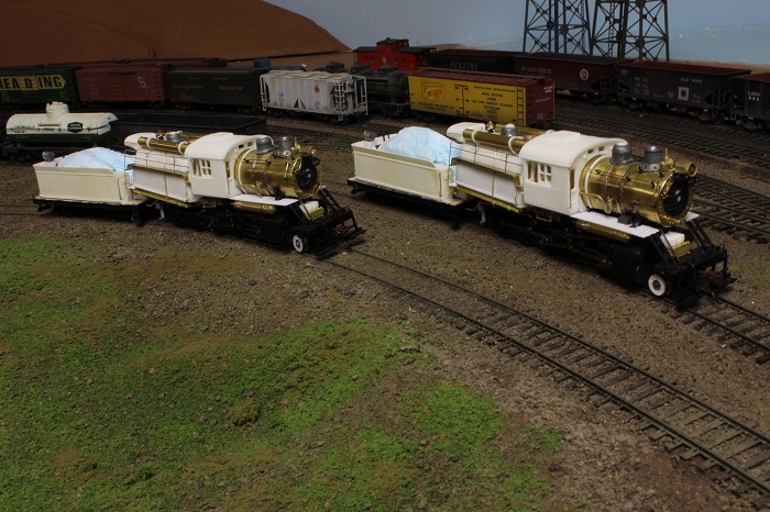 E-paw's duff challenge for 2013 - e-paw - 02-17-2013 Almost there,,,,, I have moved on to the tender lighting. I drilled out the bottom of a Shelly Castings headlight to fit a small LED. This will provide me with directional lighting . In order for the light to clear the read lip of the tender the SH&D crew had to build a simple stand from styrene to mount the fixture to. I insulated the LED leads with some liquid electrical tape. The lights were mounted on the tender deck just right of center. From there I moved on to the rear railings for the firebox walkways. When your finished you end up with a nice set of railings E-paw's duff challenge for 2013 - e-paw - 02-17-2013 I mounted the railing in place by soldering them to the walkways.. This underside shot shows the attachments a little better. The last detail that I wanted to add was the magnetic impulse collector coil. This futuristic sounding device is what picks up the signals from the rails for the automatic train stop system. Now the 2-10-0's are ready for paint. Here they are sitting at the east end of AT yard where they will be assigned. Re: E-paw's duff challenge for 2013 - tetters - 02-17-2013