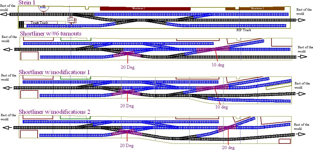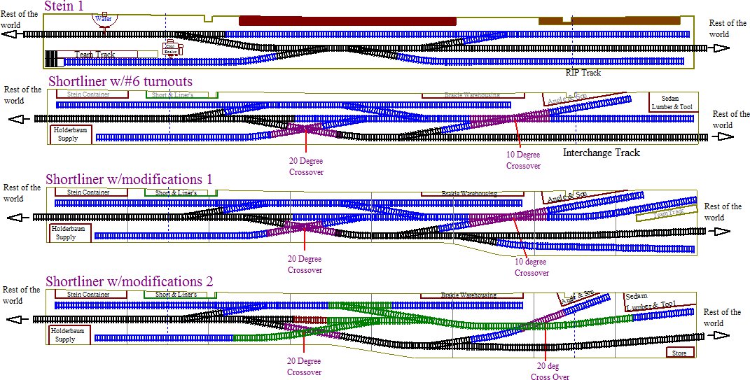 Re: Input on a "Temporary" Shelf Track Plan - Brakie - 02-24-2010 shortliner,Your layout looks better in picture then it does as a drawing. I like it. Re: Input on a "Temporary" Shelf Track Plan - Fluesheet - 02-24-2010 foulrift Wrote:Matt- when Stein was helping me with my layout design,I started with a 6' long layout. I soon found out that no matter how the track was configured it was too confining. I found that I was able to add a full 2' I'm finding this is a slippery slope! I started with 8' by 7 3/4" - now I'm looking for ways to make it longer (not much of a problem to the left) and deeper - which compromises workbench area. I think if I plan too long, my "shelf" will turn into the wall, then another wall... ![]() Seriously, I'm going to see what's realistic using Stein's, shortliner's and Brakie's feedback and stretch a little if that will allow me to incorporate all of the cool ideas. Re: Input on a "Temporary" Shelf Track Plan - shortliner - 02-25-2010 Brakie - thanks for your comment ![]() Matt - look forward to seeing what you do with it - If you need any more help, just ask Cheers Jack Re: Input on a "Temporary" Shelf Track Plan - Russ Bellinis - 02-25-2010 Fluesheet Wrote:foulrift Wrote:Matt- when Stein was helping me with my layout design,I started with a 6' long layout. I soon found out that no matter how the track was configured it was too confining. I found that I was able to add a full 2' I would suggest an alternative plan. Instead of doing a track plan that would eventually be incorporated in your layout when it gets built, just do a small switching layout that can be used to play with when you want to, can be used to test equipment to make sure it will traverse turnouts without derailing issues, and for storage as a "rip" track. That way, you can define your space for the shelf layout to coexist with the work bench without needing to make it fit future layout plans. Re: Input on a "Temporary" Shelf Track Plan - foulrift - 02-25-2010 ![]() 1.Small 2.Portable 3.Easy to run and work on. These arose from the fact that I live in a small house(half a double) and the only space I had was in my bedroom but it is also small but given it's size,2'x8' it fits nicely on top of my dresser. But as Russ suggested I also did a lot of track and switch testing before any ballast or scenery was added. When everything worked to my satisfaction I proceeded with the rest of it. This paid off because now I have something that runs good and is fun to run.The only thing that needs some work aside from the obvious detail work is I have to refine the way that I am going to operate the layout. Let me just add this-I have gotten a lot of useful input from the guys on this forum.Many of them have been doing this a lot longer than I have and the tips,suggestions,comments,etc were a great help. I learned a lot from these guys and I'm still learning. Have fun with it. Bob Re: Input on a "Temporary" Shelf Track Plan - Brakie - 02-25-2010 Matt,I was wondering if you operated the layout yet? Judging the amount of "work" that needs a' doing I suspect it could take at least 30-40 mintues at scale switching speed and allowing time for the switchmen to throw switches and open/close derails at the industries. Re: Input on a "Temporary" Shelf Track Plan - foulrift - 02-25-2010 ![]() Bob Re: Input on a "Temporary" Shelf Track Plan - Fluesheet - 02-26-2010 Russ Bellinis Wrote:I would suggest an alternative plan. Instead of doing a track plan that would eventually be incorporated in your layout when it gets built, just do a small switching layout that can be used to play with when you want to, can be used to test equipment to make sure it will traverse turnouts without derailing issues, and for storage as a "rip" track. That way, you can define your space for the shelf layout to coexist with the work bench without needing to make it fit future layout plans. Thanks for the observation regarding the incorporation of the shelf into the larger layout. When first conceived, the shelf was going to be simply a RIP track on bare wood, with a connection to (but not true incorporation into) the main line. The acquisition of several turnout building kits expanded it's purpose to a turnout testbed, which prompted this thread. These guys on this forum (and listening to discussions about small layouts on the ModelRailRadio podcast) have indeed sparked an interest in making this a design that can stand alone. Now I'm thinking using it as a scenery testbed as well -and my wife is wondering why! A lead to the main is still one of my goals (albeit a ways down the line). Your comment has also got me thinking about the permanency of any connection I may make. I'd be nice to be able to carry this thing out of the layout room if I wanted. foulrift Wrote:Let me just add this-I have gotten a lot of useful input from the guys on this forum.Many of them have been doing this a lot longer than I have and the tips,suggestions,comments,etc were a great help. I learned a lot from these guys and I'm still learning. This has, by far, been the most personally educational thread I've ever started. The quantity and quality of suggestions and well thought challenges to my plans have had an immediate impact onto the design and has completely changed my thought process, operationally and even aesthetically. I'm still circling back to and learning from earlier posts in this topic. I honestly thought that my first plan was pretty slick. And it was, if you count the number of turnouts used in that space! brakie Wrote:Matt,I was wondering if you operated the layout yet? ![]() I have, however, really started studying how cars would be moved around and even walked this discussion past my wife (she smiled and nodded politely). I've been involved in model railroading for a long time, but as I'm planning this and the big layout, I'm finding that when it gets down to the details of track planning (and I'm sure a host of other issues), what I know is pretty s