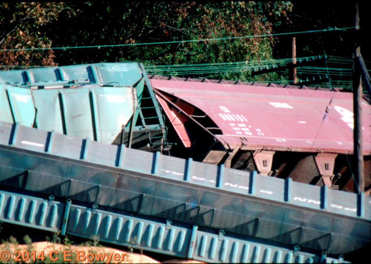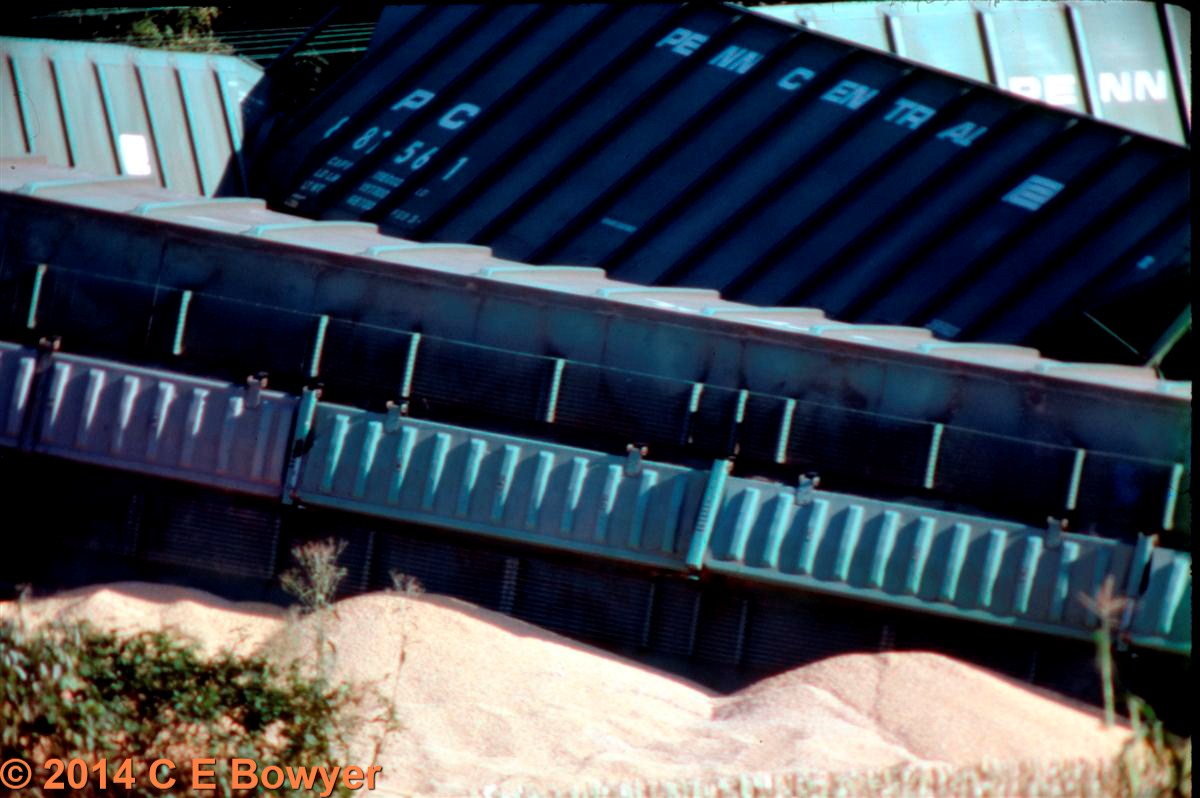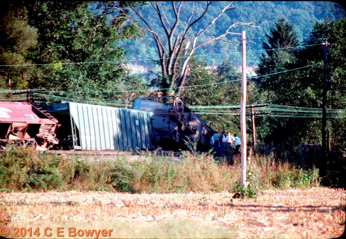 Re: Go get the wrecker - Charlie B - 04-22-2014 August 20, 1988 just east of East Palestine the rear of a stopped train was hit by a train that wasn't. Another case of missed signals. . The videos are here, 2 parts showing Hulchers in action. Really a very talented bunch, especially when they unpile the locomotives. Part 1 https://www.youtube.com/watch?v=mqNLuv_vUW4&t=186s Part 2 http://youtu.be/BgkSd0mgSBI Charlie Re: Go get the wrecker - e-paw - 04-22-2014 That's some wreck Charlie.. Seeing the hoppers still wearing EL markings was cool, Watching them get flipped over was even cooler. Not what you see in the average day. And it looks like Lester's LPB's got there hands full also. Re: Go get the wrecker - Charlie B - 04-22-2014 e-paw Wrote:That's some wreck Charlie.. Seeing the hoppers still wearing EL markings was cool, Watching them get flipped over was even cooler. Not what you see in the average day.If you watch the second video closely (about 28:15) when they are pulling the locomotive off the pile one of the cables either breaks or comes loose and almost gets the guy giving directions. He had more nerve than I have, I think there are 5 cables on that locomotive, and he is standing BETWEEN them. By the way, all of those locomotives were rebuilt. Charlie Go get the wrecker - e-paw - 04-23-2014 The D&L got it's first train through today. I got to catch it on my way home from work, just as the 6 Alco units were pulling through the water gap. Here they are running around the empties on the short siding (track 3). In a few moments they will spot the last of the damaged cars here. These are the five cars damaged in the derailment. Ill show you some of the damage. The D&L crew has also moved the empties to track 2 in order to clear the main for the loads headed for the yard in Scranton PA. Check out this flat car.. It's an ex DL&W car from the 20's still in service. it was used to haul all the rail and ties to fix the track.