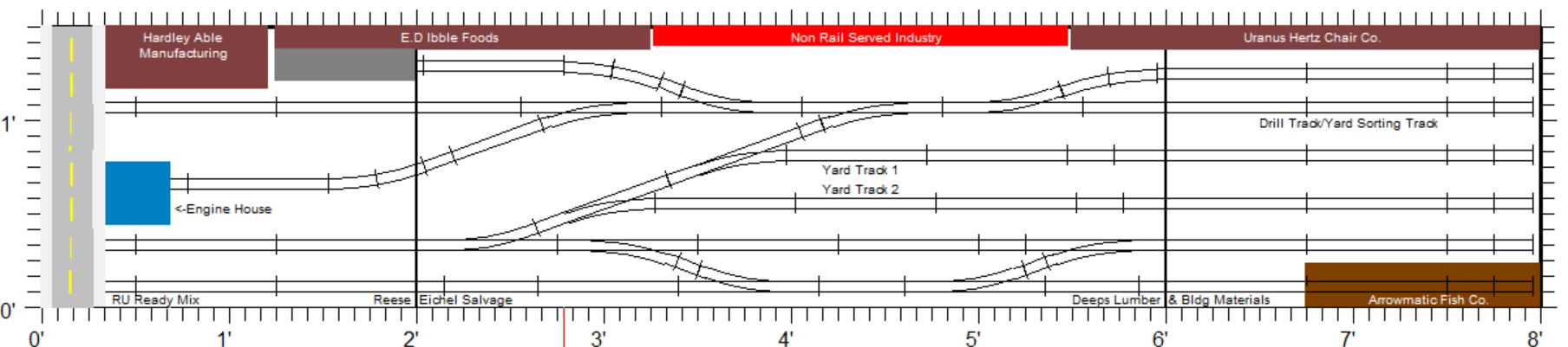 Re: 8x1.5 foot Port Able Railway HO Scale Time Saver Variati - MountainMan - 04-02-2017 I really like the names of your industries!! ![]() Re: 8x1.5 foot Port Able Railway HO Scale Time Saver Variati - Mike Kieran - 04-03-2017 Thanks Mountainman. I don't think that I'll have problems with trademark infringement. ![]() ![]() Re: 8x1.5 foot Port Able Railway HO Scale Time Saver Variati - Brakie - 04-13-2017 Mike Kieran Wrote:Thanks Mountainman. I don't think that I'll have problems with trademark infringement. If trademark infringements was a issue (gulp!) I've been in trouble with every new ISL I've built. ![]() ![]() Even my planned new Slate Creek will have real industry names.. :o Re: 8x1.5 foot Port Able Railway HO Scale Time Saver Variati - Mike Kieran - 04-14-2017 Nothing wrong with that Larry. I just remember the time that John Allen (crazy telling this story while on a timesaver variation thread) saw a business card for Hillside Lumber while in Los Angeles. He cut up the card to make a sign and the lumber company sent a letter ordering to stop using their company name. I came up with a third plan variation. In this plan, I added a drill track under the siding in the upper right corner to the chair company. That way I could use it to drill the manufacturing and food companies as well as use it for yard sorting before I start switching industries. I went back to my longer yard tracks just to give me more room. I also added an engine house where the railroad offices will also be located. Re: 8x1.5 foot Port Able Railway HO Scale Time Saver Variati - RobertInOntario - 04-15-2017 Looks like a great layout plan. I might "copy" this in a few years! ... Or modify it to 6' long. Rob Re: 8x1.5 foot Port Able Railway HO Scale Time Saver Variati - Mike Kieran - 04-15-2017 It would work on a 6 foot length if you're doing steam/transition era. I'm just building it for IPD box car era. Re: 8x1.5 foot Port Able Railway HO Scale Time Saver Variati - RobertInOntario - 04-15-2017 Mike Kieran Wrote:It would work on a 6 foot length if you're doing steam/transition era. I'm just building it for IPD box car era. Thanks! I mainly model British steam (or British transition era), so I think this layout plan would lend itself nicely to that. British freight cars are also much shorter than North American ones, so the small size would be good. 6' also fits better with the amount of space I have, but I'll see how things develop. Re: 8x1.5 foot Port Able Railway HO Scale Time Saver Variati - Genetk44 - 04-15-2017 Mike Kieran Wrote:It would work on a 6 foot length if you're doing steam/transition era. I'm just building it for IPD box car era. Mike...would the track-planning software that you drew your plan with be able to redraw it to a 6ft length in HO???? :mrgreen: Re: 8x1.5 foot Port Able Railway HO Scale Time Saver Variati - dingbat - 04-16-2017 What minimum frog number are you using for this? The turnouts look even less than #4s? Maybe #3s? Re: 8x1.5 foot Port Able Railway HO Scale Time Saver Variati - Brakie - 04-16-2017 Mike,I like your latest upgrade.. The engine house is a nice touch. Which engine house are you planning on using? Re: 8x1.5 foot Port Able Railway HO Scale Time Saver Variati - Mike Kieran - 04-16-2017 Larry, I have a Pikestuff Single Engine House and an old AHM wood engine house, but I would most likely go with the Pikestuff (although, I may interchange the two if I decide to run transition era equipment). Genetk44, I'm using XTrackCAD and I'll try to redraw it by the end of next week. RobertInOntario,, I'll try a 6 foot deign by the end of next week. Dingbat, the turnouts are all Atlas Code 83 18 inch radius Snap Track. If the 50 foot cars can't handle the potential S curve problems, i"'ll just run transition era equipment. Re: 8x1.5 foot Port Able Railway HO Scale Time Saver Variati - Brakie - 04-17-2017 the turnouts are all Atlas Code 83 18 inch radius Snap Track. If the 50 foot cars can't handle the potential S curve problems, i"'ll just run transition era equipment. -------------------------------------------------------------- Mike,I've been there and done that and you shouldn't have any issues with 50' cars. I don't like Snap crossovers but, a small interesting to operate ISL beats no layout IMHO. As far as a 6 footer a snap switch is a very good choice. I had a 8 foot ISL that I stored in a broom closet between operation. My "bench work" was the dinning room table-we had a kitchen table that we normally used. Re: 8x1.5 foot Port Able Railway HO Scale Time Saver Variati - Genetk44 - 04-17-2017 Thanks Mike..look forward to it. Re: 8x1.5 foot Port Able Railway HO Scale Time Saver Variati - Mike Kieran - 04-17-2017 No problem Gen. Larry, I don't anticipate problems, especially since the longest train will be 3 cars and speeds will be glacially slow. Re: 8x1.5 foot Port Able Railway HO Scale Time Saver Variati - Mike Kieran - 04-21-2017 I designed a layout for 6x1 with folding wings, but for some reason, the text feature in XTrkCAD isn't working, so I'll just post a layout without text for now. |