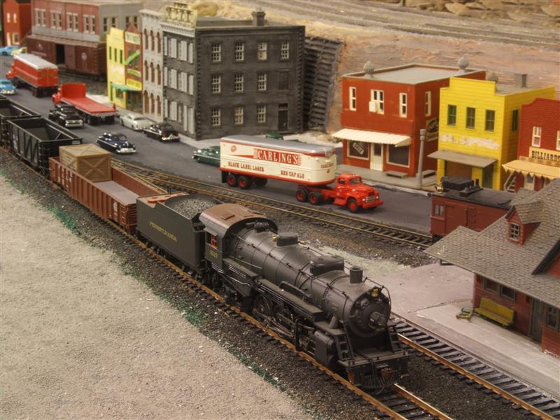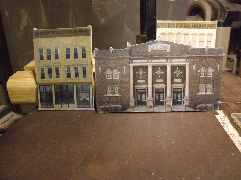 Re: Charlie b's layout - Charlie B - 10-13-2011 Hi Blue Many moons ago I downloaded a bunch of free printable building fronts, and as we have had two days of rain I thought I would play with them to see what I could do. The downloads were pretty good so I thought I would see what I could do to make some buildings of my own too. so my first project was this one:The old Belvedere Hotel in Apollo, Pa I corrected the camera distortion and did a lot of stretching and cloning and came up with this: Then I did the front of what used to be a wholesale grocery warehouse in East Liverpool, Ohio. : The next one was a lot tougher because of its size, The old Crockery City Brewery, I had to do that is 2 parts. Re: Charlie B's layout - Charlie B - 10-13-2011 Here is the Brewery after a couple of hours work: The next step was to print the buildings. Then I used 3M general purpose spray adhesive to attach them to plywood and Masonite backing (I have lots of little scraps laying around.) after the glue set up, I sprayed the paper with a heavy coat of flay finish Krylon clear, and when it was good and dry I cut them out with my 15 inch scroll saw After cutting I sprayed another coat of Krylon, and used some craft paint to paint the edges. Just to see what they would look like I stuck them against the backdrop and took this picture. (the sky is a photoshop because this section isn't done yet.) Charlie Re: Charlie b's layout - Ralph - 10-13-2011 Wow! Very cool Charlie! I wouldn't even know how to begin doing that image magic of yours but the results are impressive! ![]() Ralph Re: Charlie b's layout - cn nutbar - 10-13-2011 Charlie---I'm very impressed,your prints remind me of the Kingmill buildings.I hear Doctor Wayne likes to stay at the Belvedere when he visits Re: Charlie b's layout - Charlie B - 10-13-2011 If anyone wants the PDF files for the buildings I'm doing, PM me, and I'll see if I can sent them. They are large files. The JPGs would work but I don't know if they would print the right size. The ones I downloaded I had to convert to HO, and according to copyright I can distribute them as long as they remain free so you are welcome to them too. I plan to work on lots more this winter. Charlie Re: Charlie b's layout - Charlie B - 10-15-2011 For all of you that want to try to make sense of one of the areas I'm modeling here is a link <!-- m --><a class="postlink" href="http://www.bing.com/maps/?v=2&cp=qs3fyc88jckf&lvl=18.36940919908005&dir=1.3043406745874577&sty=o&where1=East%20Liverpool%2C%20OH&form=LMLTSN">http://www.bing.com/maps/?v=2&cp=qs3fyc ... orm=LMLTSN</a><!-- m --> Here are a couple labeled pictures of what track was there when I was growing up. This view is looking north: Notice the odd shapes of the buildings, nothing is square. This is a view of the same buildings looking south: To the east the area looked like this: and next east : The track went into a small yard with 4 team tracks. They were removed in the late 50's but the track still went uptown farther until the end of the 60's, the branch to the old Riggs building was still used until 1977. A wholesale auto parts company used to get box cars of new tires delivered there. Re: Charlie b's layout - Charlie B - 10-15-2011 Farther east the track served a lumber company, a coal dealer and a GMC truck dealer : There was a switch which ran to the south that service the A&P and the Throfare stores in the 50's and before that there was a pottery on that siding. East Liverpool was the pottery capital of the world, now everything is gone. Charlie Re: Charlie b's layout - Charlie B - 11-21-2011 Ralph's motivational photos got me motivated so I worked on an area today. I had been stumped because the terrain wasn't quite right for a little town, but I want one there anyway. It will be one end of a small short line so it has to have at least one freight customer, and I want it to be the terminus of a commuter run which will involve 2 short switching lines as well as a reverse move over the main. Hopefully that will add enough headaches for a dispatcher when I have some operating sessions. I picked up a bunch of buildings for a very good price on Craigslist and with some cleaning and painting and re-gluing here and there I will have enough to fill in until I can do some detailing. Anyhow, here are some pictures of Lowtown under construction. Charlie Re: Charlie b's layout - Tyson Rayles - 11-21-2011 Looking good, love the low angle shots! Re: Charlie b's layout - Ralph - 11-22-2011 Looks like a good place for a town to me! Rail station, freight customer, main street...what's not to like!?! ![]() Ralph Re: Charlie b's layout - Charlie B - 11-22-2011 We will see if we can make it more believable today. All we have here is rain. Charlie Re: Charlie b's layout - Charlie B - 11-22-2011 And it did rain all day. I really enjoy retirement when I don't have to leave on a day like today. Here are a few pictures of today's progress. Thanks for the inspiration Ralph Charlie Re: Charlie b's layout - cn nutbar - 11-22-2011 Very nice Charlie---a great scene with lots of operating/switching possibilities---I really like the passenger station stub ![]() Re: Charlie b's layout - Tyson Rayles - 11-22-2011 ![]() ![]() ![]() Re: Charlie b's layout - Ralph - 11-22-2011 Nice work Charlie! You get a lot done on a rainy day! I like the results. Nice collection of vintage vehicles too. ![]() Ralph |