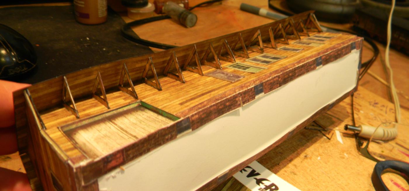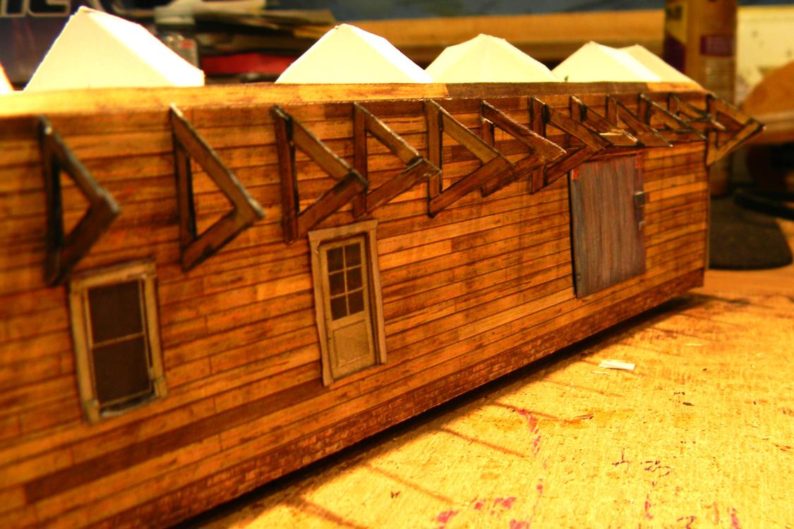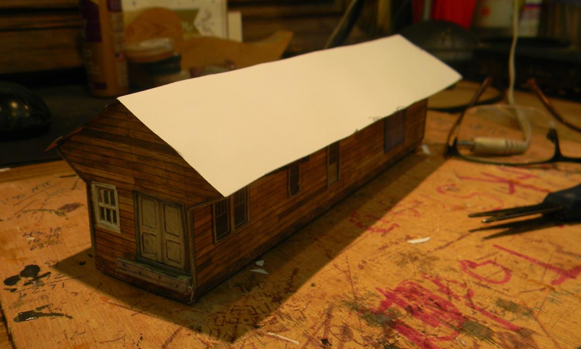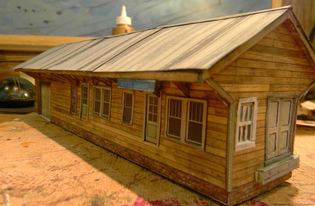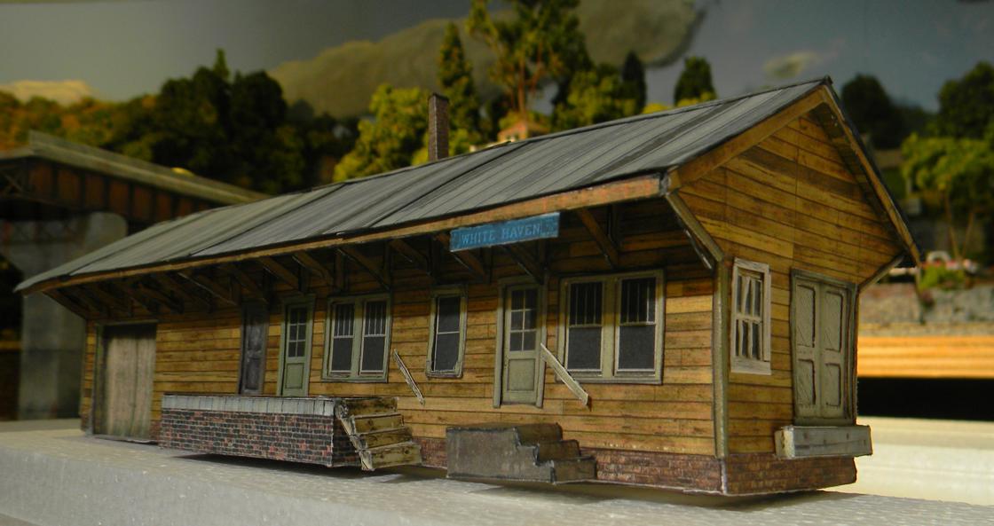 RE: Rainbows in the Lehigh Valley Gorge - TMo - 10-09-2025 Yep - definitely the same proportions and functionality, Jim. If I don't like what I end up with, I could start over. While I was watching baseball last night I mostly finished two of the four sides. I still need to figure out some rafter supports - I may resort to some plastic there. RE: Rainbows in the Lehigh Valley Gorge - jim currie - 10-09-2025 sounds like you got some time on your hands try this link and type in what type of railroad structure you want. Looks like a good start could never build anything out of paper we have a silverfish infestation. Jim https://www.loc.gov/pictures/ RE: Rainbows in the Lehigh Valley Gorge - TMo - 10-12-2025 A Silverfish invasion would certainly be bad news for my layout. I've been working on a 8-mm VCR over the last couple of days - trying to make the thing operational by buying a parts machine. Trouble is, you never know if the parts you want are still in good shape. In this case? 2 days of futility and I've come to the realization that 30-year-old plastic parts just aren't going to hold up much longer. Sony doesn't stock the parts and the leftovers are cracking too. Time to junk her. Another refugee of the disposable goods economy. After that frustration, I got back to some building of the White Haven LVRR station. The four exterior walls have been completed aside from some detail work and foundation adds on three of the sides. In preparation for the roof, I built one of 32 of the rafter trusses (equilateral triangle-shaped truss in the center of the photo) that will support the extended roofline on each long side of the building. Each truss is made from six pieces of sliced paper siding glued back to back. Tedium x 32! Several loading docks and steps from the doorways will also have to be built, and all of the corners will get corner trim after assembly. The roof fascia boards on the prototype have scalloped edges. I don't think I want to drive myself nuts doing that, but I may.... RE: Rainbows in the Lehigh Valley Gorge - TMo - 10-13-2025 Installed some of the detail trim and joined the four sides together. Next, I'll be reinforcing the structure internally to take some of the bow out of the middle before making those rafter trusses and installing some corner trim followed by the roof construction. RE: Rainbows in the Lehigh Valley Gorge - jim currie - 10-13-2025 looking like a good build, did at one time have some car kits that had cardstock printed sides like 60 years ago if memory serves me right, they were made by red ball don't know where they went. Jim RE: Rainbows in the Lehigh Valley Gorge - TMo - 10-14-2025 Haven't heard of Red Ball, Jim. I ran into Clever Models quite by accident. I was thumbing through an old Walthers catalog a few years ago looking for an engine house and saw a section devoted to their products and took a look. I've been hooked ever since. As long as I can print to my inkjet printer, I'm in business. The big plus for me is that you buy the designs and can print as many as you want - in the case of this particular project, I've drawn from 6 different models to pull in details that I'm using, and I've rescaled some other portions of files to produce individual components. When all is said and done, if you don't include glue, cardstock and ink, I paid about $2 for this station. The marathon production of roof trusses is finally finished to include doing all of the edge work on each of these 30 rafter trusses. Ready for roof construction! I did put the corner details in and added internal reinforcement at the base and at the ceiling level. The sporadic roofline supports will give me something to glue the roof to. I may get to some of that tonight, but the next few days are full with visiting kids and grandkid as well as dear old dad being pulled into a prospective home inspection for my other son. Things should settle down by Monday night. RE: Rainbows in the Lehigh Valley Gorge - jim currie - 10-15-2025 if I remember right the line was started before ww2 the printed car sider I think went the way of the dodo in the 60 after the line was sold I think the new owner made Bristal board sides for a bit then went to plastic kits i think they were still addable in the early 2000 after several new owners the printed sides were impeccable very clean print will look through some 1940 mr's to see if I can find a photo to post. Jim RE: Rainbows in the Lehigh Valley Gorge - TMo - 10-16-2025 I look forward to seeing those photos, Jim. Until then, photo progress of my own as I've installed all of the roof truss supports (had to do something a bit different over the sliding barn door due to space limits on the slider. If I had to do it all over again, I'd have made one single truss in MS Paint and duplicated it 30 times before printing - I could have produced much better uniformity. However, these will do. I cut to strips of siding to serve as the underlayment for the roof and glued those in place. Next comes a complete fascia board around the edge of the roof followed by a "metal" roof to cover all of the white space. Don't know when I'll get to that... RE: Rainbows in the Lehigh Valley Gorge - jim currie - 10-16-2025 trusses took great wood and paint don't age at the same rate gives the building a look of age. here is a photo of a add in a model railroader as for the age you can guess by the price its old'. Jim RE: Rainbows in the Lehigh Valley Gorge - TMo - 10-17-2025 Wonder how those box cars would have held up over time, Jim... I did get the fascia built (the photo below is folded siding that got glued on top of the underlayment).... and roof installed this evening along with the White Haven sign pulled off of the same website I got the station photos from. Next come some loading docks and steps. All in all, this kitbashed station is going to work well once I get a space to install it. RE: Rainbows in the Lehigh Valley Gorge - jim currie - 10-17-2025 (10-17-2025, 05:58 PM