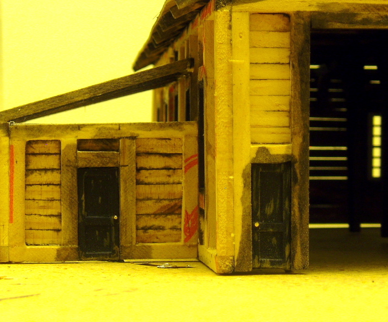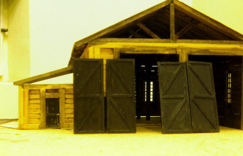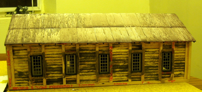 Re: Nachoman's summer 2010 enginehouse challenge. - Ralph - 08-17-2010 Looking great!! Even if you can't see the roof framing you'll always know its there and that you did it well...and if it can be seen at any angle it will look great in photos! Ralph Re: Nachoman's summer 2010 enginehouse challenge. - nachoman - 08-21-2010 I made some doors from wood I had in my scrap box - leftovers from previous projects. The handles are short pieces of brass rod inserted into holes drilled through the doors. I also made some engine bay doors. I debated leaving the engine bays open, but I had plenty of scrap wood from which to make doors. I haven't decided whether to make the doors operable or not, but I am leaning towards making hinges similar to steamtrains. And, I also began making and installing a roof. I used a cardboard underlayment for rigidity, and then made steel roofing by rubbing heavy duty aluminum foil against a piece of scrap ribbon wire. It is a little dinged up because the aluminum foil I used is not quite as thick as I would want, but I think the overall effect is good. I only completed one side and weathered it to see how it would look. I was originally going to do the exterior walls with the same corrugated metal as the roof, but now I am thinking a board and batten type siding may look better. Re: Nachoman's summer 2010 enginehouse challenge. - Gary S - 08-21-2010 Woah, kevin, that is turning out to be a terrific build. The roof is EXCELLENT! I vote for a photo-tutorial on how you made the corrugated tin. Beautiful work, Kevin, and you will always take pride in that you did it completely from scratch. Oh... I vote for the hinged doors... Re: Nachoman's summer 2010 enginehouse challenge. - nachoman - 08-22-2010 I'll see about making a short tutorial on the roofing - But I really don't know if I can do much better than I have already described! I take a piece of aluminum foil, cut it to size, lay it onto a piece of ribbon wire that I have glued to a block of wood, and then rub the foil with my finger. I'd do much better to find a bigger piece of ribbon wire so I can can sandwich the foil between two pieces of wire. Then, the whole thing gets weathered using an ugly alcohol-based wash that began as the india ink staining solution I used on the wood. I added more alcohol, and some model master acrylic "rust" paint, and some matte medium in the hopes of giving the wash more thickness without adding more color. Then I sprayed the whole thing a with Rustoleum matte spray. The matte spray also seems to give the foil a little bit of rigidity and allows the roof to withstand a little bit of handling. Re: Nachoman's summer 2010 enginehouse challenge. - MasonJar - 08-22-2010 That's a great roof! I have made corrugated roofing just like that, although I never thought to actually glue the ribbon wire to something to make it easier to handle... If you get a chance to do up a tutorial, I'll gladly add it to The Academy. Andrew Re: Nachoman's summer 2010 enginehouse challenge. - doctorwayne - 08-22-2010 I agree, Kevin, that's a great-looking roof. Thanks, too, for your doorknob suggestion, which I'll steal immediately for my crossing shanties. I was going to turn-down the heads of some pins, but your idea is easier and looks great. Wayne Re: Nachoman's summer 2010 enginehouse challenge. - Steamtrains - 08-22-2010 As I mentioned in my last post on my build, I wasn't sure whether to go with a tar paper or corrugated metal for the roof. Your pictures just made up my mind... Is the foil you used the commercially (grocery store) kind of foil..?? I've been scrounging through my son's "mess box" (he's a digitral controls engineer), but haven't found a suitable size of ribbon wire...I hope the die I purchased is home by the time I get back.... Re: Nachoman's summer 2010 enginehouse challenge. - nachoman - 08-22-2010 Steamtrains Wrote:As I mentioned in my last post on my build, I wasn't sure whether to go with a tar paper or corrugated metal for the roof. Your pictures just made up my mind... It is the heaviest duty foil I could find at the store. I went to a "warehouse" type grocery store thinking they may have a restaurant grade foil that is a little thicker, but what I bought may actually be a little thinner than the Reynolds "heavy duty" foil. My piece of ribbon wire came from something I took apart. It was only a piece about 6 inches long, and not wide enough. I cut it in half, and glued the halves next to each other on a block of wood in order to get the width I wanted. I tried to find a wider piece of wire at a thrift store, but didn't see any. Re: Nachoman's summer 2010 enginehouse challenge. - Gary S - 08-22-2010 Kevin, you are very innovative! I was thinking about the ribbon wire, and realized I would probably need some that was wide, which makes the search more difficult. Then you mention glueing two pieces side by side! Doh! Why didn't I think of that? :oops: Thanks for all the great ideas!