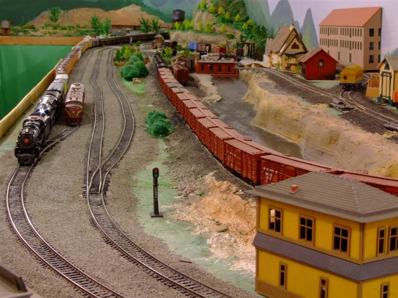 Re: Charlie b's layout - Charlie B - 10-10-2012 A K4/T1 double head a 32 car mail and express train toward the home stretch while a pair of E's wait for the main. Charlie Re: Charlie b's layout - sailormatlac - 10-10-2012 Charlie, I love that stock car train on the elevated track! Matt Re: Charlie b's layout - Charlie B - 10-10-2012 sailormatlac Wrote:Charlie,I'm glad you like it Matt, but for some reason the cattle all run when they see it coming ![]() Re: Charlie b's layout - Charlie B - 10-29-2012 a baby trainmaster handles 20 loads of ore. Charlie Re: Charlie b's layout - Charlie B - 10-29-2012 A mail and express train passes a local heading for the meat plants and post offices on the "other side" Charlie Re: Charlie b's layout - Ralph - 10-29-2012 Love the black and white Charlie! ![]() Ralph Re: Charlie b's layout - Charlie B - 10-29-2012 It is raining hard here, and has all day. Sandy is here, so here is a little video. <!-- m --><a class="postlink" href="http://www.youtube.com/watch?v=ehFjalso-E4&feature=youtu.be">http://www.youtube.com/watch?v=ehFjalso ... e=youtu.be</a><!-- m --> Charlie Re: Charlie b's layout - Tyson Rayles - 10-31-2012 Thanks to the hospital's Wi-Fi I was able to enjoy your excellent video, the still pics are very nice as well Charlie. ![]() Re: Charlie b's layout - Steamtrains - 10-31-2012 That's a great shot with the "kinky" track..... ![]() I laid mine using a straight edge....should'a known better :oops: Re: Charlie b's layout - Charlie B - 10-31-2012 Some of the kinks really get exagerated with the telephoto lens but I did not want the track as straight as it is with the prototype today. When they first worked the track in a section I remember it was pretty good, but it didn't take it long to start some weaving and deviation. Stick rail was the rule. A lot of the old timers eyeballed the track to keep it aligned, they were there way before lasers, and did one heck of a job. We did our share of aligning with lining bars and eye sight on the KJR and it would look great until you took a picture with a telephoto. ![]() Charlie Re: Charlie b's layout - Charlie B - 10-31-2012 Tyson Rayles Wrote:Thanks to the hospital's Wi-Fi I was able to enjoy your excellent video, the still pics are very nice as well Charlie.I'm glad you enjoyed it Mike. Anything to help fill in the time on your road to recovery. If you are like me there is nothing that you care to watch on television. I have gone to watching the old timers on HULU. They were made when it took talent to make a TV show, and it was funny to watch the comedians pull off things that parents would understand but you weren't embarassed to watch with your kids. I am looking forward to more layout pictures from you, and I'm sure glad you can post. Charlie Re: Charlie b's layout - Steamtrains - 10-31-2012 Charlie B Wrote:Tyson Rayles Wrote:Thanks to the hospital's Wi-Fi I was able to enjoy your excellent video, the still pics are very nice as well Charlie.I'm glad you enjoyed it Mike. Anything to help fill in the time on your road to recovery. You're right about TV nowadays. I have access to about 130 channels (cable), but I routinely watch 4 or 5...The rest is mostly garbage... ![]() Re: Charlie b's layout - Charlie B - 10-31-2012 [quote="Steamtrains You're right about TV nowadays. I have access to about 130 channels (cable), but I routinely watch 4 or 5...The rest is mostly garbage... :([/quote] I have dumped Direct TV after having it for 12 years. I just could not justify it any longer. I can get better entertainment off the local oldies channels of which I get 3 over the air in addition to 8 PBS channels that do have a couple hours a week when they are not trying to raise money. We even have a 24/7 weather channel local and I bought a ROKU 2 that I hooked up to the TV and can get many movies and old TV shows for the 7 dollar monthly HULU subscription price, and it is there when I want it and that comes over the internet. Charlie Re: Charlie b's layout - Charlie B - 11-01-2012 I posted a little more video. <!-- m --><a class="postlink" href="http://www.youtube.com/watch?v=Ia2gQFvprqs&feature=youtu.be">http://www.youtube.com/watch?v=Ia2gQFvp ... e=youtu.be</a><!-- m --> I have started work on the team track/uptown area which will have a small coal yard where house coal is sold as well as a warehouse and a lumber yard. The building that was a ware house had, what I believe, was an outside freight elevator. The original building was for storing pottery and straw, which was used to pack the pottery ware. There was a covered loading dock and I am betting the ware was brought on the elevator from the upper levels on the 4 wheeled carts that could be pulled right into the box cars where the ware could be packed for shipping. In the early fifties the building was converted to a very large hardware store, and they warehoused just about anything that they could turn a dollar on. On my pike they recieve everything they sell by rail ![]() Charlie Re: Charlie b's layout - teejay - 11-01-2012 You sure have made a lot of progress in the past several months ....must be at it every day . Looking really good ! ![]() T |