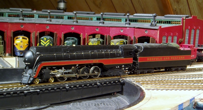 Re: Action at the roundhouse - toptrain - 04-14-2011 Hello Mr Nutbar. frank here. I wasn't sure about the road but when I seen you were a CN person I put it in hoping it would be right. It is a stock triang locomotive. I have another Triang. It is number 2335. The same loco but with a wide vision tender. Another North of the border prototype. If you want I'll post a photo of that also. Most everything else I have is PRR and CNJ with a few other North east roads in steam and diesel. I have some other triang nad Honby trains also. Many recient aquisitions from trades they a friendly fellow from south of London. frank Re: Action at the roundhouse - toptrain - 04-15-2011 Here a N&W J enters the turntable at Frankford This is a reworked Bachman. It has been repowered with a Bowser drive. frank Re: Action at the roundhouse - toptrain - 04-24-2011 A group of pacifics, All Triang, awaite access for a TT ride o a storage track at the Frankford Round House. Transcontinetal, Princess Royal, Princess Elizabeth, Princess Victoria. Frank Re: Action at the roundhouse - BR60103 - 04-24-2011 Frank: a lot of familiar locos in that shot. And who's hiding behind the water tower? For a note, the transcontinental pacific looks more like a CPR than CNR. It was also unfortunate when they decided to replace the trucked tender (which looks very CPR to me) with the Gresley 4 axle one. Re: Action at the roundhouse - Charlie B - 04-24-2011 Here's a little late night action at the Wilderson engine house Charlie Re: Action at the roundhouse - cn nutbar - 04-25-2011 Charlie---that's a beautiful night scene,very realistic