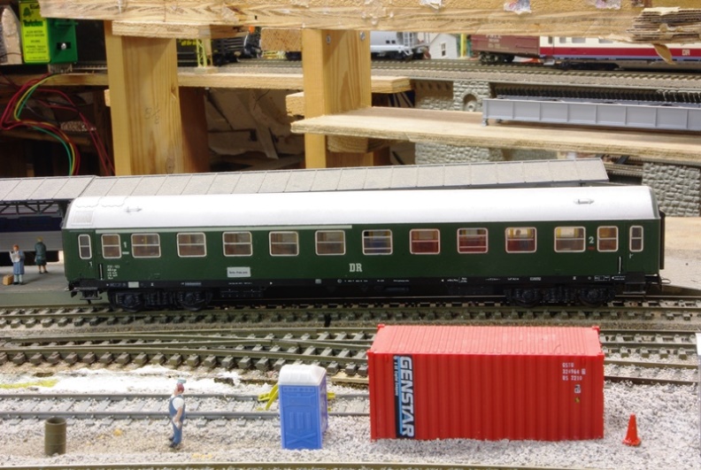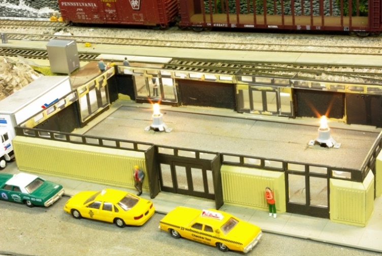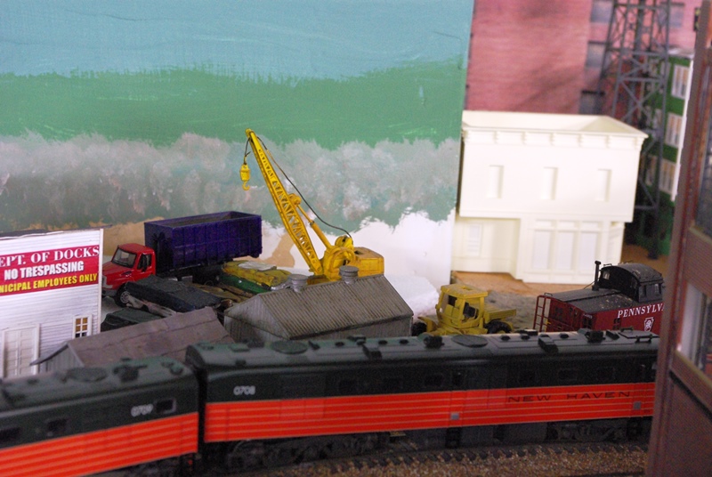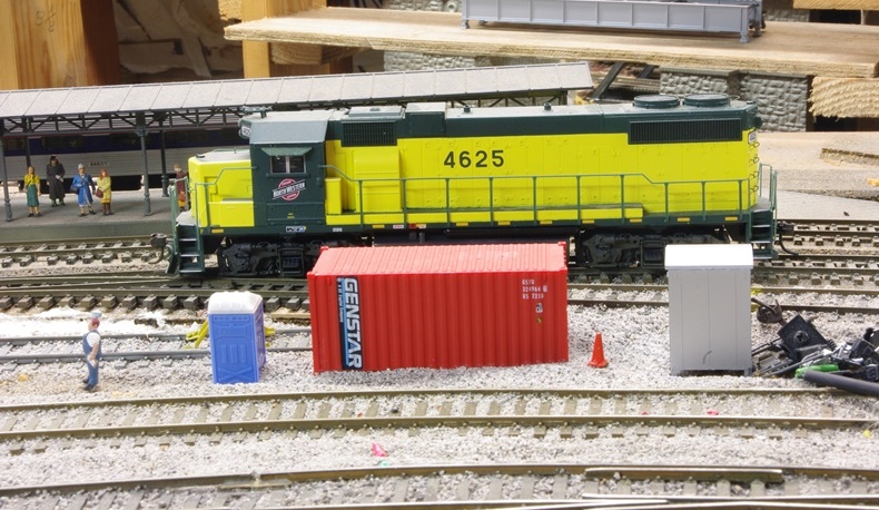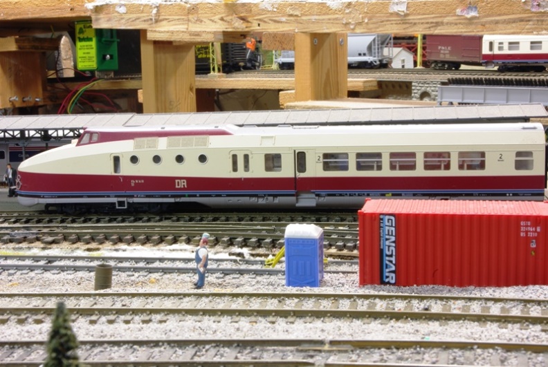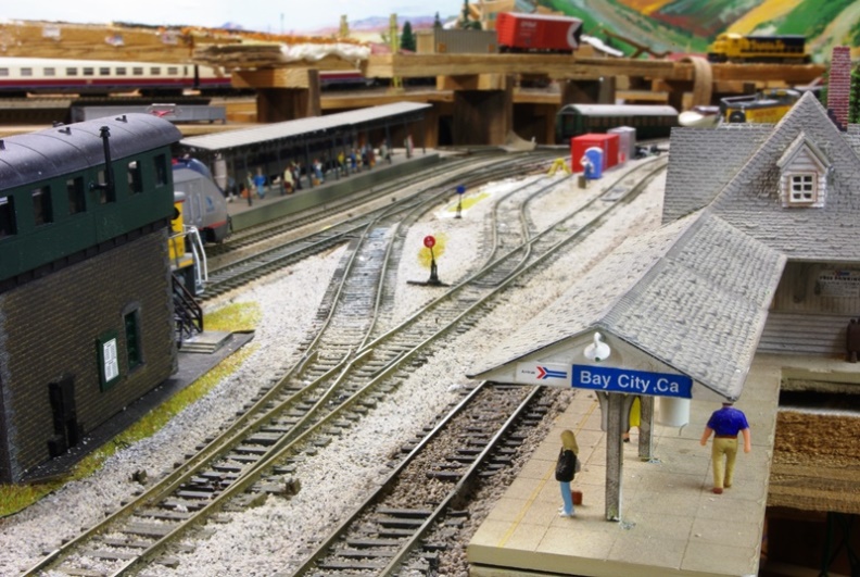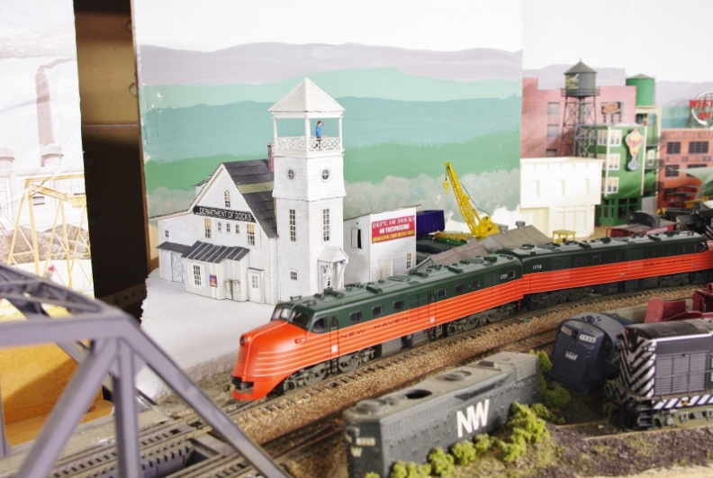 Re: Progress Shots - doctorwayne - 04-12-2013 jwb Wrote:Bay City like in The Big Sleep. That's the original, I take it. You had me worried that it was Bay City, as in "Rollers", and I don't mean British slang for an expensive ride. Wayne Re: Progress Shots - jwb - 04-12-2013 Here is the next shot just to the right of the last shot above. This is the nitty-grittiest area I have to deal with, where a European style main line comes within a few inches of a US style main line. There is a highway crossing in the immediate foreground, which will make a hard left to turn into the street that runs trackside in the photos just previous. There are parts of California that look very European, so that helps. Re: Progress Shots - eje - 04-12-2013 It is all so wonderful. Nothing else on Earth looks like California, the Golden State. Re: Progress Shots - jwb - 04-23-2013 In the spirit of a couple of other recent posts on passenger service, here's an overhead view down the main line at my Zenith Amtrak passenger station. The Amtrak station, on the right, is the Walthers model, recently revived (but this one is from the 1990s), a model of the Rochester, NY station. (Here's a shot of the prototype, early one very cold morning): This is one of the areas I've been returning to. The model roof is off as I go back to installing lighting. I need to add more paving to the area around the station. Yesterday I added the short platform to the right with the traffic cones at the end. On the to-do list will be to add Wheels of Time yellow rubber platform edge decals to this short platform, as well as another platform elsewhere on the layout. The white stuff on the center track is from a friend who was "helping" me with scenery, who spilled a rubber mold filled with not-quite-hardened plaster all over the area. This is the rest of what I need to clean up, but the end is in sight, just a lot of work with an old toothbrush. Then finishing ballast in the area and other incidental details, like more figures, platform lights, BLMA relay boxes, etc. Re: Progress Shots - jwb - 04-26-2013 The Zenith Amtrak depot had a lot of pieces fall off over the years, so I re-cemented a lot of components. I also finished installing lights: I'm happy to see that you can see the lighting when the roof is on: Now I think I may get one of those Miller Engineering flashing Amtrak billboards to go on the roof. I'd be just as happy with the sort of lighted signs that are on the prototype, but they don't seem to make those. Re: Progress Shots - faraway - 04-26-2013 That is a nice depot. Especially the roof boarder is very attractive. Re: Progress Shots - Ralph - 04-26-2013 I like it a lot too! Re: Progress Shots - jwb - 05-04-2013 I've referred earlier to the ovaloid route on my bigger peninsula that will represent either the Northeast Corridor or an electrified European (primarily German, Austrian, or Swiss) main line. I hate the wiring work I'm having to do here, but I'm making progress. The outer track of the double-track oval is now fully wired. There are crossover connections at the area illustrated with my normal US CTC-style main line, and a small engine terminal for a switcher in this area, called variously Bay City or Jaques on the timetable. Now that it's got minimal wiring, I've set up a train that takes US style freight cars onto the outer European oval and treats it, for the time being, as staging. Here's a GP38-2 going to pick up its cars off the interchange track: It picks up the two cars and seesaws onto the "Northeast Corridor", or maybe it's the "Geislinger Steige": And then disappears into a tunnel, which for the time being is the staging track, although eventually it will normally operate as a separate ovaloid from the main line. The point of these photos, again, is not to show finished parts of the layout, but to induce me to make more progress! I still need to do final leveling and ballast of the track, wire some more of the switch machines, finish wiring the inner oval and some other tracks (including a motor storage that I've mentioned in previous posts), and finally install Sommerfeldt catenary. You can see a post in the bottom photo. Re: Progress Shots - faraway - 05-04-2013 It is very unusual how you integrate US and Europe on one layout. Do I see some German train in red and cream color in the background? Looks like some TEE/IC passenger cars. Re: Progress Shots - jwb - 05-05-2013 It's the Kato DR/DDR TEE -- I forget the designation. It's worth pointing out that the Pennsylvania Railroad in particular emulated a lot of European practices, especially in architecture, although in the 19th and early 20th centuries, many mechanical people were ethnic Germans (Altoona, PA was named for Altona in Germany; the "oo" was meant to be pronounced as the German single 'o', and I believe locals pronounce it the German way) -- the two most prominent motive power heads were named Axel Vogt and William Kiesel; I believe Kiesel studied at Kiel. The K4 was Kiesel's. But it's only the one area of my layout that I try to directly combine European and US practice. However, the old Pola platform you see in the background of some shots, while very European looking, is also very typical of PRR practice. Re: Progress Shots - jwb - 05-05-2013 Here's a view of the one area where European and US stuff comes together on the layout. In the lower right is the end of the Amtrak platform at Bay City, CA. To the left is a German-style signal cabin and farther beyond is the station platform that could be either Northeast Corridor or someplace in Europe. The connecting tracks between Europe and the US are in the center of the photo. They layout is designed so that US equipment can move over European track to reach one industry and staging, but I don't intend to run European equipment on US track, as part of the US style main line is code 70 track, which doesn't work with European non-RP25 wheels. Here is the end unit for the East German TEE-IC train you