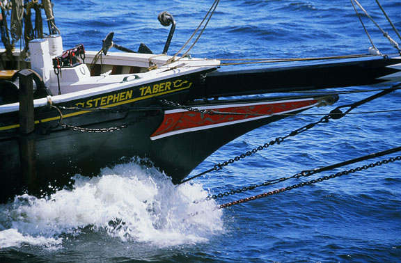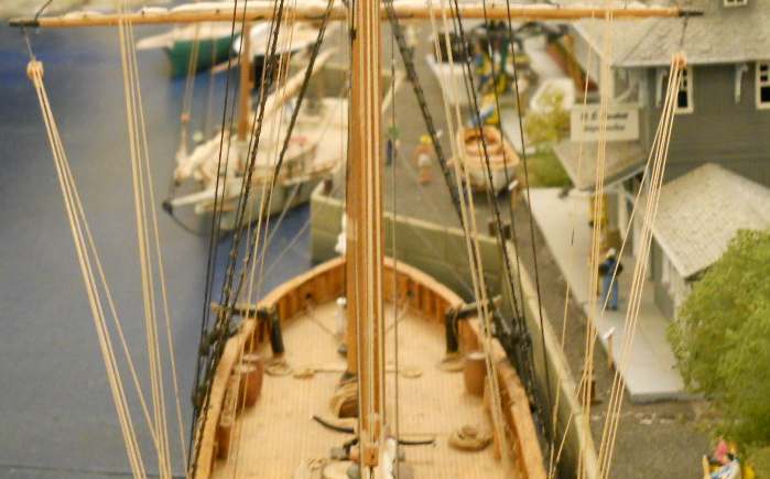 Re: "New modules" - Sumpter250 - 11-02-2011 Spent the better part of the last week trying to figure out how I could re-do the mainline track supports in the area of the "tunnel", and it would require a major rebuild of that end of the module.....sooooo, the "tunnel" is going to stay. It may, however, be " given a better face ", but not until after Trainfest. I have started the rigging of the schooner. Some of the basic iron work is in, and the bobstay, and part of the rigging of the fore stay, from the stem up to the bowsprit, has been done. an over all shot. The chain bobstay, and the fore stay rigging. you can see the chainplates ( 3 ) just by the forward port lite of the main cabin. This shot of the schooner Stephen Taber, from the web, is what I am using as a guide for the rigging under the bow sprit. I took a week long cruise in Taber in Sept., 1969. She's 140 years on the water this year ( 2011), and still cruising !!! Both she, and the schooner Grace Bailey, were built within 20 miles of where I grew up....and a " day or six " before I was born...........although, lately, I'm beginning to wonder about that part........they're not looking as old as I feel. :o