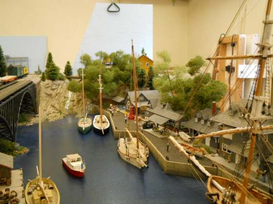 Re: "New modules" - Sumpter250 - 09-10-2011 doctorwayne Wrote:Great looking scenes, Pete. I think that if you "fluffed-up" the top of your willow tree, it would look just fine - you seem to have captured the "weeping" part of the equation quite nicely. Yeah, I kind of "underdid" that part, but at the time I thought it would be enough. Still, if you look at the left hand tree, in the shot of the real thing, and compare it to the shot above ( high angle shot of the tree and the boathouse ), I didn't miss by much. I'm a bit reluctant now about ripping it out to add a little more, so I'll have to figure out a way to add to it, while it's still on the module. ( lots of "masking", and covering, of everything else around it, it involves spraying the tree with clear lacquer, after adding the expanded polyfiber, and then sifting the "leaf stuff" over the wet lacquer ). Re: "New modules" - doctorwayne - 09-10-2011 You could probably do it as a separate piece, working on a sheet of newspaper, then plop it in place like a toupee. Since you don't want to have it flop off during shipping (or in a high wind) a few discrete drops of white glue atop the original should do the trick. Wayne Re: "New modules" - Sumpter250 - 10-24-2011 I've had well over a month to think about that willow.....it will go to Trainfest, and after I get back from that, it gets taken back off the module and " modified ". I'm still not really happy with the hanging branches either. I mentioned the willow to the guys from Woodland Scenics, at the I-Hobby Expo, in Rosemont yesterday.....their response was, "that's a difficult thing to model". Re: "New modules" - Tyson Rayles - 10-24-2011 their response was, "that's a difficult thing to model". They were a lot of help! Re: "New modules" - Sumpter250 - 10-25-2011 Tyson Rayles Wrote:their response was, "that's a difficult thing to model". They were a lot of help! Yeah, and maybe that's why they don't have one in their product line. ![]() Here's one of those times where " voice " carried more message than word can. They sounded "impressed" that anyone would try to model a willow, or surprised.......either way, I got their attention. Including the willow, there are now seventy trees/ bushes/shrubs, on the modules.....spent the better part of yesterday "growing" more of them. Re: "New modules" - Sumpter250 - 10-25-2011 First, a view of the Brigantine's fore deck, from a " B'osun's chair" at the peak of the Gaff. The Village and museum, with the added trees. A look back at the boathouse, with the engine facility in the background, with the added "foliage". The engine facility, Coal, sand, and water. and last, Former Sierra Railway #38 on the turntable. There are a few small details I'd like to get added before Trainfest, but getting at least one of the three remaining sail powered vessels rigged, is the current priority. Then, Skyboards on, back tables on, and test all the track for operation, before packing the modules for transit to Milwaukee for Trainfest. Re: "New modules" - Tyson Rayles - 10-25-2011 Awesome! If it's possible the ships look even better than the train stuff! Re: "New modules" - Steamtrains - 10-25-2011 Those boats are real works of art...As is the whole scene... Re: "New modules" - Sumpter250 - 10-26-2011 Steamtrains Wrote:Those boats are real works of art...As is the whole scene... Tyson Rayles Wrote:Awesome! If it's possible the ships look even better than the train stuff! ....and therein lies the secret of the trick. Each new detail, is but another brush stroke. Ship modelers will tell you, " one does not build a ship model, one builds models of parts of a ship, and assembles them into a finished model ship. ...One does not build a model of a scene, one builds models of parts of a scene, and assembles them, each part, where it "belongs", until a scene is "right". Building the models is the "work", the scene the models occupy ? that, is the "art". A "layout" sometimes has to go without the impact of "scene" because of space, and/or operation requirements. The simple constants of modules, make the creation of "scenes", not only possible, but necessary, to balance the lack of "rail space". I like, working in the medium. Many thanks to all for the positive comments.....
