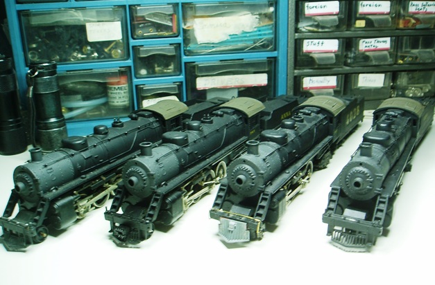 Re: Your work area - doctorwayne - 04-08-2009 When I first noticed this thread, I thought "No way! I'm not showin' off what a slob I am!". I'm in the midst of a fairly large project: rebuilding/detailing/painting and lettering a hundred-or-so freight cars, so there's lots of stuff pretty-well all over the place. After a little thought, though, I realised that a quick tidying (about 5 minutes) would probably make it presentable enough to show to my fellow slobs. My shop is almost strictly for working on trains, and is fairly compact. The main room is about 7'x10', not counting the entryway, with a storage area/library in a closet under the stairs, and an adjoining paint shop, about 4'x7'. Here's the view as you enter the room, with the closet (out of sight) to the left, and the paint shop (also out of sight) to the right: [album]880[/album] Here's the closet area. Most of the stuff on top of the shelf is unbuilt kits, both rolling stock and structures, while my collection of RMC is in the cut-down detergent boxes on the shelves. The binders are of photo-copied pages, mostly from TRAINS and MR - this is where I research both my own projects and all those weird or obscure questions that often pop-up in the forums. [album]875[/album] To the right as you enter, on the facing wall, is this old radio/hi-fi, which does get used on those rare occasions when the flip-top isn't covered with stuff. :oops: The door is to the paint shop: [album]878[/album] Here's where I do most of the work. The drawers are filled with tools, along with reference photos, manufacturers' catalogues, and my rolling stock rosters: [album]879[/album] The parts cabinets are actually filled, mostly, with parts. I made the holder for the Evergreen plastic strips from some sheet plastic (I buy it in 4'x8' sheets), and most of those sleeves have several packages of product in each. I also store wire and some stripwood here. The Bachmann boxes atop the filing cabinets are some of the locos that need to be re-worked:[album]877[/album] This view is looking back from the paint shop. The small black shelf on the opposite wall holds more reference books and catalogues, with more locos to be re-built, on top in boxes: [album]876[/album] Here's my spray booth, with the compressor in the lower cupboard, and spare filters, etc. above. The airbrush supplies are kept in the drawer, with cans of thinners and related stuff in the cupboard below that: [album]873[/album] This is the work area across from the spray booth. More parts, and tools, too, in the storage bins and drawers, and paint, lots of paint. The small jars on the top shelf are thinned for spraying, while that in the rack and on the bench is un-thinned.The drawers are for tools - soldering irons, and mill files, mostly, as this area, when I'm not in the midst of a painting project, is for the "heavier" work. The real heavy-duty stuff, such as grinding and melting lead, is done in a regular shop in the garage. The cupboards below hold more paint, containers of various paint strippers, boxes of spare parts, and more "future projects". [album]872[/album] Here's the other end of the same bench, mostly covered in just-painted trains. I keep my set of heavier numbered drills, #1 to 60, here, along with a motor tool. The small vise, partially visible at lower right, isn't mounted to the bench, as I like to place it where it's easiest to work, depending on the particular job. Heavier work that needs to be held firmly is done in the garage. The file card box contains decals, with more sets standing between the two parts cabinets. Dry transfers are in the separate drawer right at the top of the stack. The boxcars sitting on the shelf are on my test track (the power pack can be seen in the previous photo, also on the shelf): this is where locos are tested and couplers are adjusted: [album]871[/album] I hope that you've enjoyed this short photo tour of the EG&E Shops. Wayne Re: Your work area - Bigsteel - 04-09-2009 ok wayne,you win ,you beat my organazational skills by far,and i think most people here will agree hock: heres my workshop.my layout and everything is in the garage so i try to do most work in the summer.cold ohio winters do not agree with paint and glue drying times ![]() heres a relatively bad shot of the whole thing.with most of my heavy tools and paint being on the shelves and drawers of the tool box to the left.still need to get a spray booth though ![]() --josh Re: Your work area - toptrain - 04-09-2009 Heres is mine. Four Aristo-craft Mikados sit on the work bench. frank |