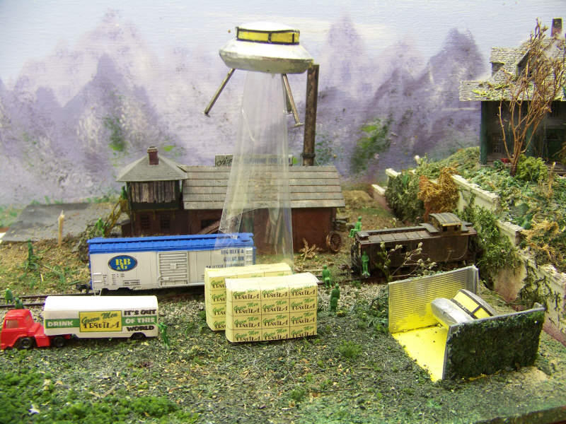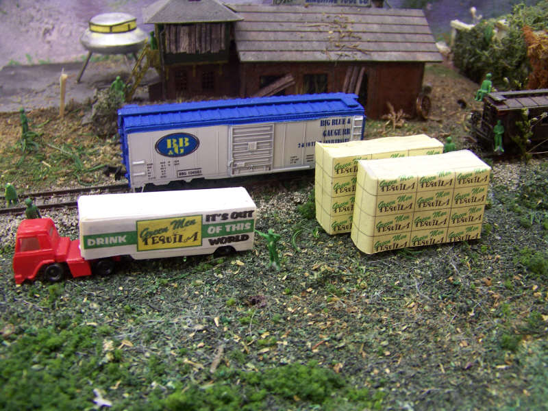 BBG100101 has one more stop before heading out. Now this may look like an abandon siding, and it was for years until the little green men, (LGM), decided to use it as a landing site. Well, these people found that if they were to stay here, they needed a way to support themselves since their monetary system they had back at the old planet wouldn't get them very far HERE. They headed south of the Arizona border and made a deal with some people there and acquired a tequila facility. Their brand is "Green Men Tequila" and is loved by these little green people all over. This is where BBG100101 comes in. This is the first shipment of this precious commodity to other LGM in other states. Here we see where a truck has unloaded its cargo of tequila and a crew of green people are standing by to load the car. Once loaded, the car will make it's way to Michigan for distribution in that area. Note that even with this going on, the site remains an active landing and take-off facility to transport these beings around the universe. Because of this, we cannot divulge the exact location of this site. Nope