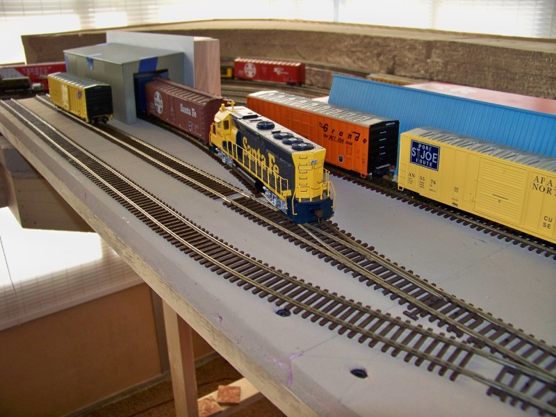 Re: Office Shelf Layout - lajry - 03-21-2011 Howard Couldn't help doodling w/ your track plan. Just some ideas to give you to think about. Started out just wanting to get rid of those 2 S curves in upper middle. But ended up giving you a little yard plus a couple more industry spots. You don't have to do it all at once. Just do what you want when time & money allow. Re: Office Shelf Layout - hyawn - 03-22-2011 Thank you all for looking. Greg, I have always modeled the Santa Fe. My dream layout will be the Joint Line between Denver and Palmer Lake CO in 1989. By modeling that area I can include the Rio Grande (my other favorite RR) and the Burlington Northern. Right now I don't have the room in our current house for that layout. I have plans for a 11' x 11' around the walls layout in a room next to my office but no work started at present. This shelf will be a freelanced industrial branch off the main layout. Bil, Your right. It's just a mockup. Rob, Yes this is for my home office. Stein, Already done. Andy, Like some of the changes you made to the track plan and will rethink in the future. Phase 2 is not cast in stone so I can make changes, if fact I haven't selected all the industries yet. Below is picture of the track that I put down Monday. Nothing is permanent yet, just tacked down with track nails. I'm not able to do any more on this till next Sunday and then I hope to run some trains and see how the plan works. Howard Re: Office Shelf Layout - Sumpter250 - 03-22-2011 Howard, to Big Blue ! Looking forward to seeing where your project goes, and how you get it there. Because of having to move so often, I got into modular/sectional layouts, and have stayed with it all these years. Re: Office Shelf Layout - hyawn - 03-28-2011 I was able to switch the layout for about a half hour Sunday and am pleased how the track arrangement works. For now the trackplan will stay as is for phase 1. Now it's time to work on the buildings that I had just mocked up. Next weekend I'll try to work on the track and see if I can get that completed. Will have a busy week again so we'll have to see how that works out. Thanks all for following along. Howard Re: Office Shelf Layout - Gary S - 03-28-2011 Hey Howard, I like the original track plan. Looks like it will be fun to operate that, with plenty of possibilities. In the second to last photo, what brand is the Santa Fe boxcar? Re: Office Shelf Layout - P5se Camelback - 03-28-2011 It's all looking good, Howard. I like where you are going. I'll be watching with great interest. But, I'm curious ...