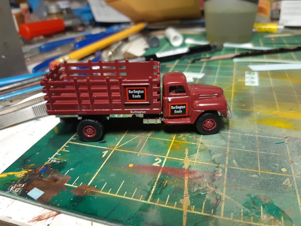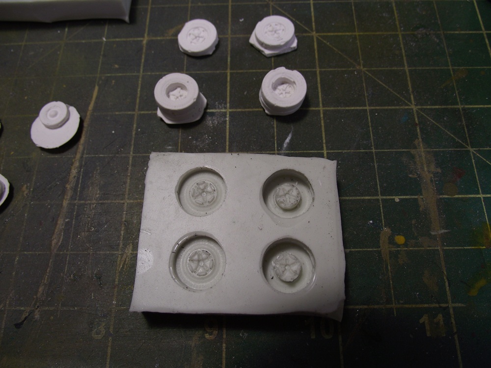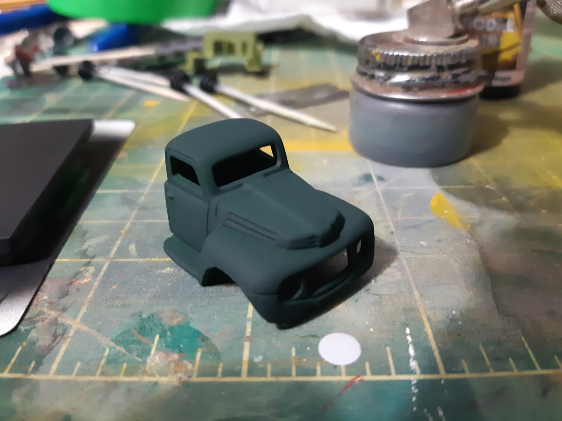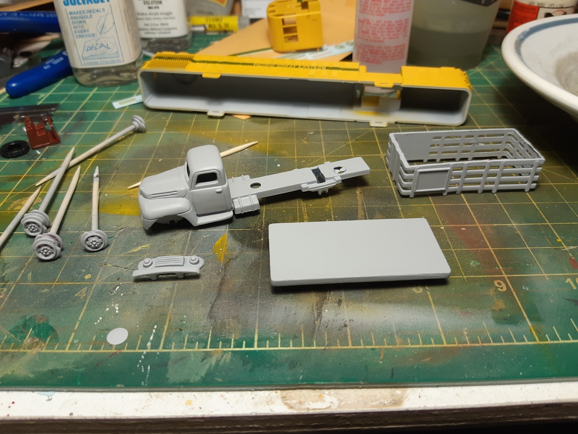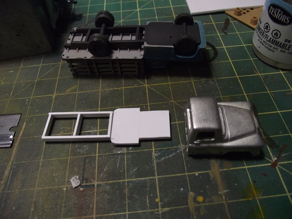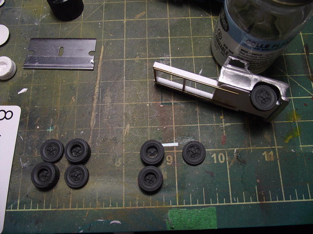 RE: Alloy Forms Vehicles - cnrglen - 07-06-2025 I've been building some more vehicles on the side starting with this: a 1950 ford stakebed. I'm not sure on the manufactuerer as it's a metal cab and flatdeck. I drilled out the rivets and used some paint stripped on the cab and deck. I also removed the tires from the whels as I'll be repainting the wheels as well. RE: Alloy Forms Vehicles - cnrglen - 07-06-2025 I decided to modify the truck into a flatdeck by cutting off the stakebed sides. Then I spray primered everthing. The grill and chassis was chrome plated and didn'y look right so a soak in vinegar took the plating off. RE: Alloy Forms Vehicles - TMo - 07-06-2025 Great prep work, Glen. Looking forward to once again seeing a magnificent end product! RE: Alloy Forms Vehicles - cnrglen - 07-08-2025 Thanks, I enjoy these small projects that I can fit into my hectic schedule as of late. I hope in the near future I can start to get some time to get back to the larger ones. I did paint the cab today: I went with a dark flat green which I will spray a semi-gloss clear later. I find that a high-gloss finish often looks toylike on an HO scale vehicle, even one that would be new on the showroom floor. RE: Alloy Forms Vehicles - cnrglen - 07-12-2025 I finished the truck off this afternoon: As mentioned I airbrushed the cab in a semi gloss, which probably came out a bit more glossy that I planned. I painted the frame, wheels and deck black before using some scale 2X6 to add a wood deck and them fabricated a wood headache rack. I did a bit of weathering (dirt) with my airbrush on the deck, frame and cab. the frome grill was painted chrome with a black wash I plan to use it as a junkyard truck, with a wrecked car on the back. RE: Alloy Forms Vehicles - hillyard999 - 07-13-2025 That is a nicely done truck. I especially like the grill, and the wheel/tire distinction. When I noticed the tires, I then noticed the light spray of road dirt. Nice! RE: Alloy Forms Vehicles - cnrglen - 07-14-2025 Thank you. On to the next project to continue to clear off the workbench Alloy forms used to sell this junk auto pack. They usually contain 5 auto shells from their vehicle line that are either intentionally damaged (dents ect) or they are 'seconds' that the casting process didn't work out. I bought two of these packs off ebay as I'm planning of a scrapyard on the layout. However in one of the packs was the cab of their 55' chev three ton stakebed truck in fairly good shape. I figured I could make something out of it besides a junkyard cab. Since I already had the 55 stakebed I think I'll make a tow truck out of this cab. I used the original truck to start to build a new frame out of styrene. I still have to source wheels and a wrecker body but with the cab aready here, why not see what I can do? RE: Alloy Forms Vehicles - cnrglen - 07-16-2025 I sourced the wheels I decided to cast my wheels. I had a two part silicon mold maker and used the wheels off an old Magnuson ford tractor truck. I made a 3-d dam out of styrene and glued the original metal wheels to the bottom. Then I mixed the silicon and poured it over the originals. It took a couple days for the silicon to cure but after that I now have a source for unlimited truck wheels. I decided to experiment with the material to cast the new wheels in and used hydrocal instead of resin. As they are a small part and not really going to be handled I figured to ease of mixing some hydrocal plaster would have it's adavantages. after pouring and letting the castings cure I popped them out of the mold and sanded the backs flush with the tires The original cast metal wheels are on the left, the hydrocal castings are on the right. The only thing I have to do after removing the castings from the mold and sanding the backs is to seal the casting with some clear flat to keep them from chipping the paint off later. |