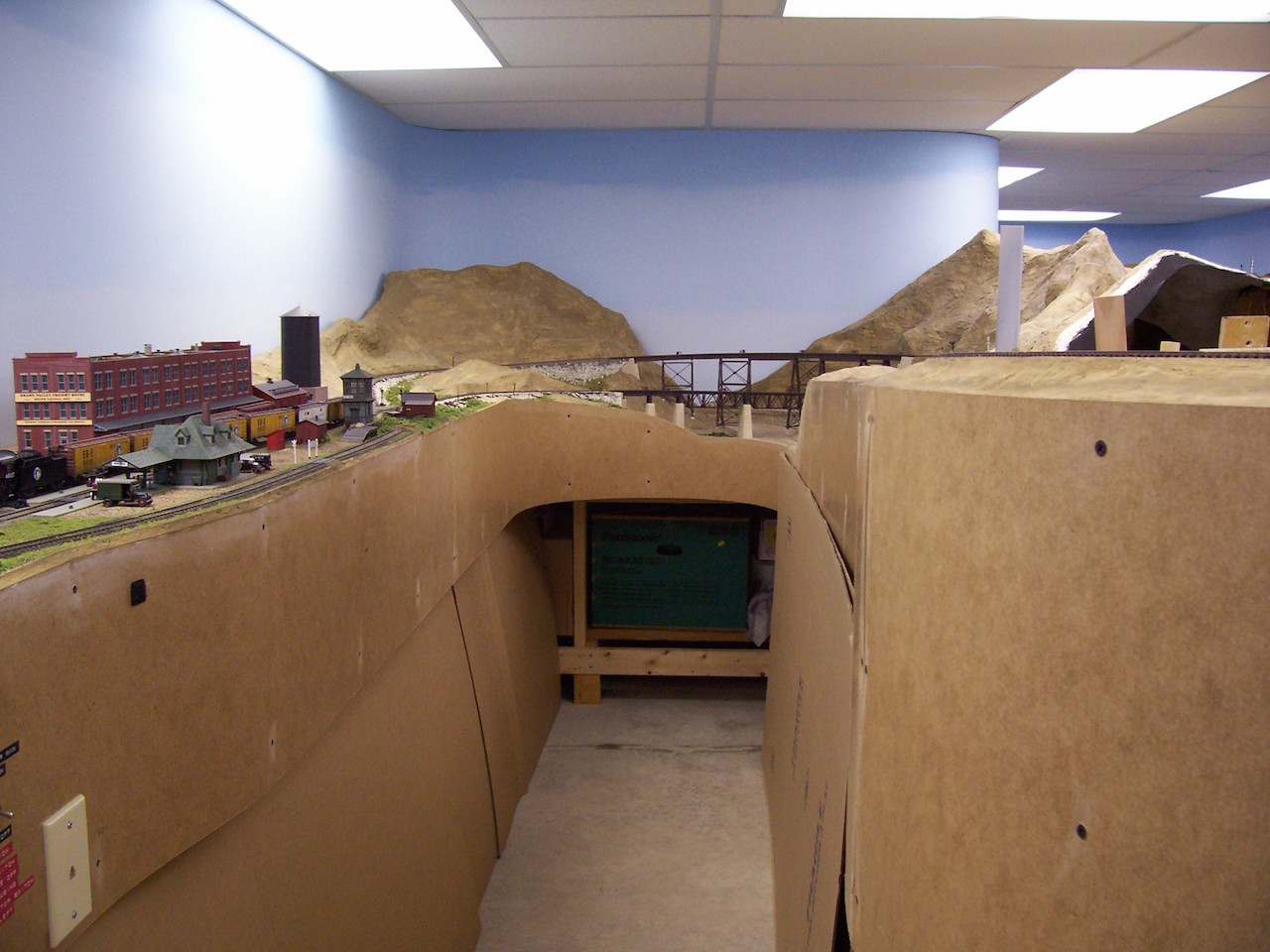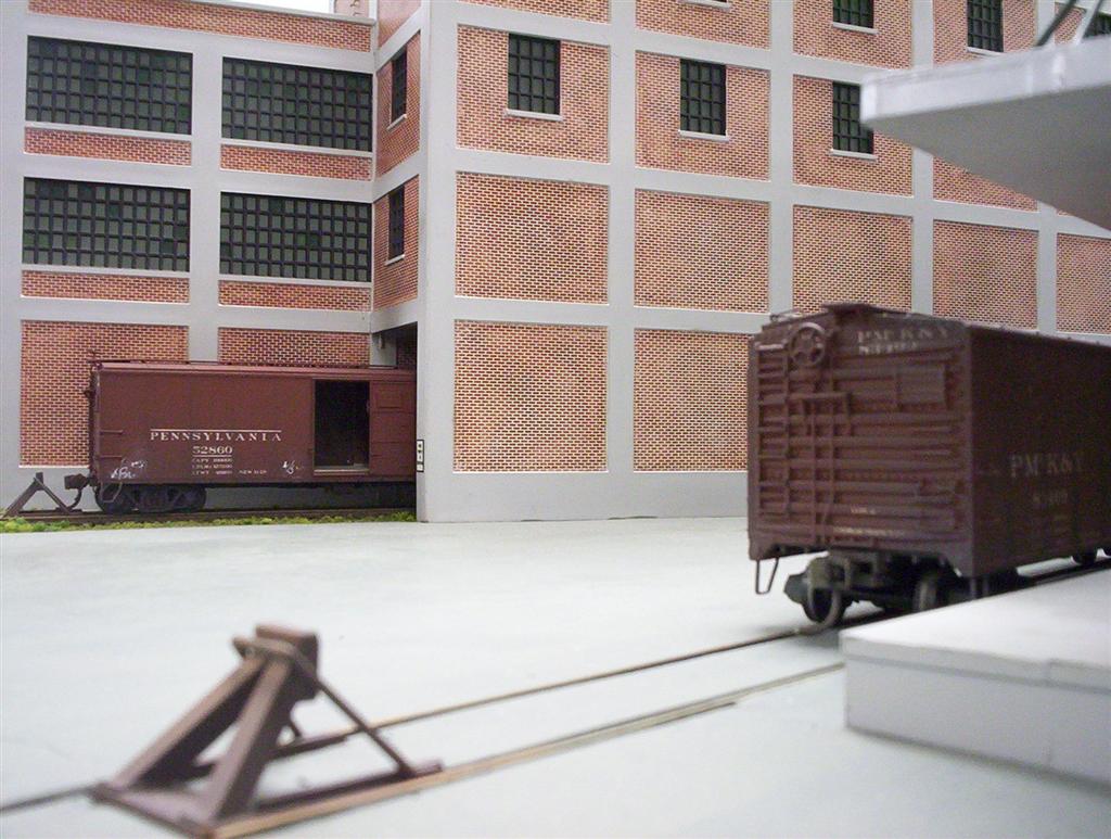 Another view from the opposite end of the entrance aisle. Part of Dunnville can be seen at right: the structure sliced-off at the edge of the layout is the Evell Casket Co. Beyond that, the staging area, with excess car storage on shelves below.