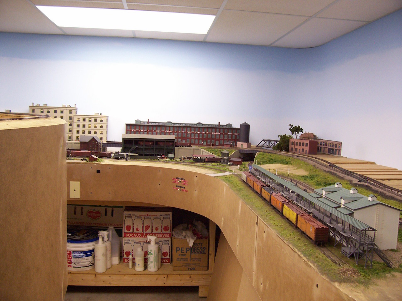 A view from the entrance to the room: Port Maitland is to the right, with stacked staging yards to the left. Freight car storage is in boxes below.