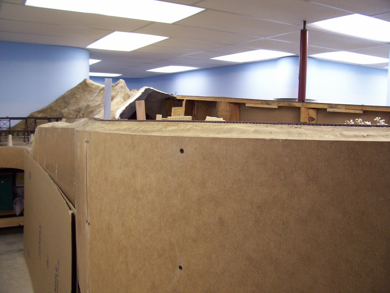 Looking slightly left and back towards the door, the Lowbanks shop complex is in the centre, with Lowbanks stretching out to the left, on the Chippawa Creek aisle. The aisle on the right leads back to the entrance to the room. The gap in the backdrop is to allow for installation of a compound bracket, which will help support the proposed second level of the layout.