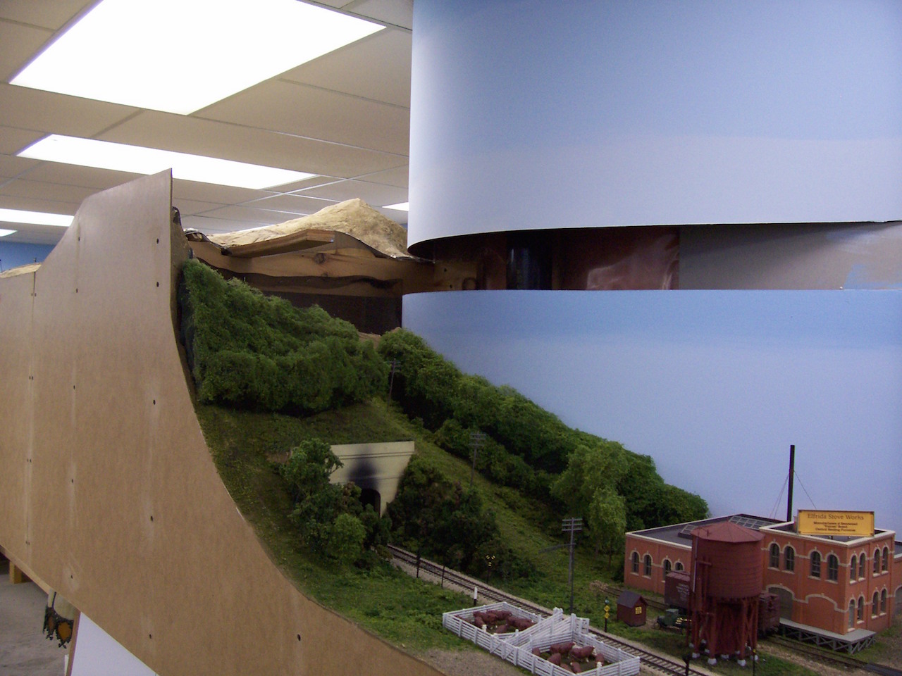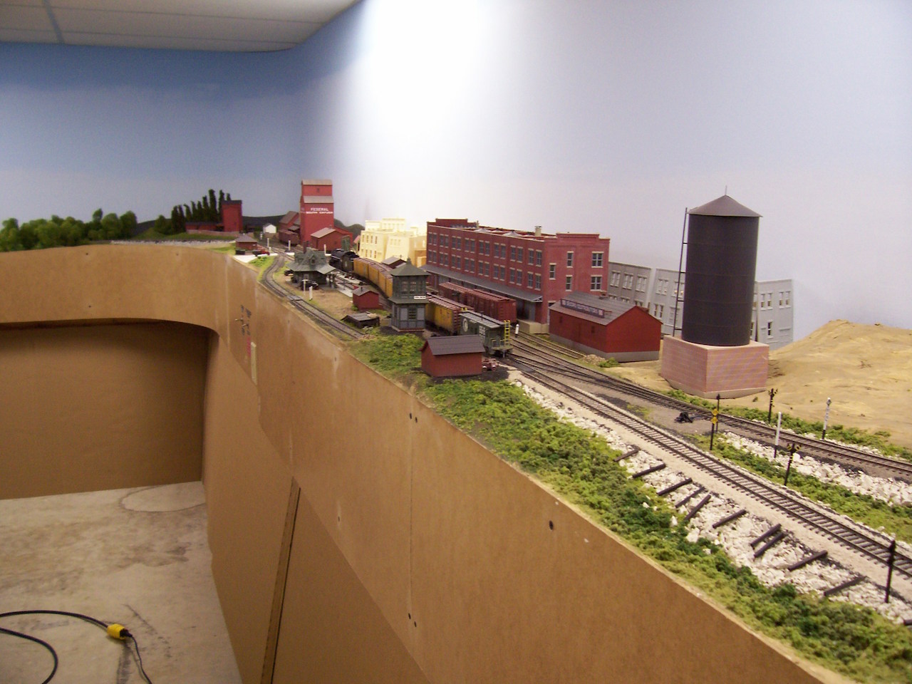 A view from the end of the Chippawa Creek aisle. Lowbanks is on the left, and Elfrida to the right. Dunnville is in the centre background. Above Elfrida, the opening in the backdrop is where the second level of the layout will begin.