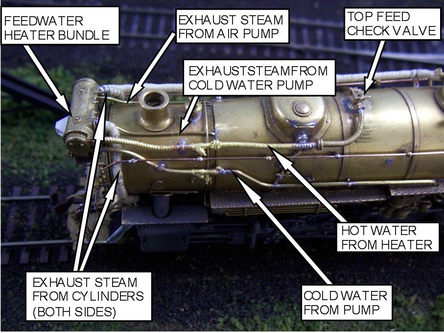 I've also added a couple which show the various parts of the Elesco feedwater heater system with labels, and a close-up view of the front end of the locomotive.