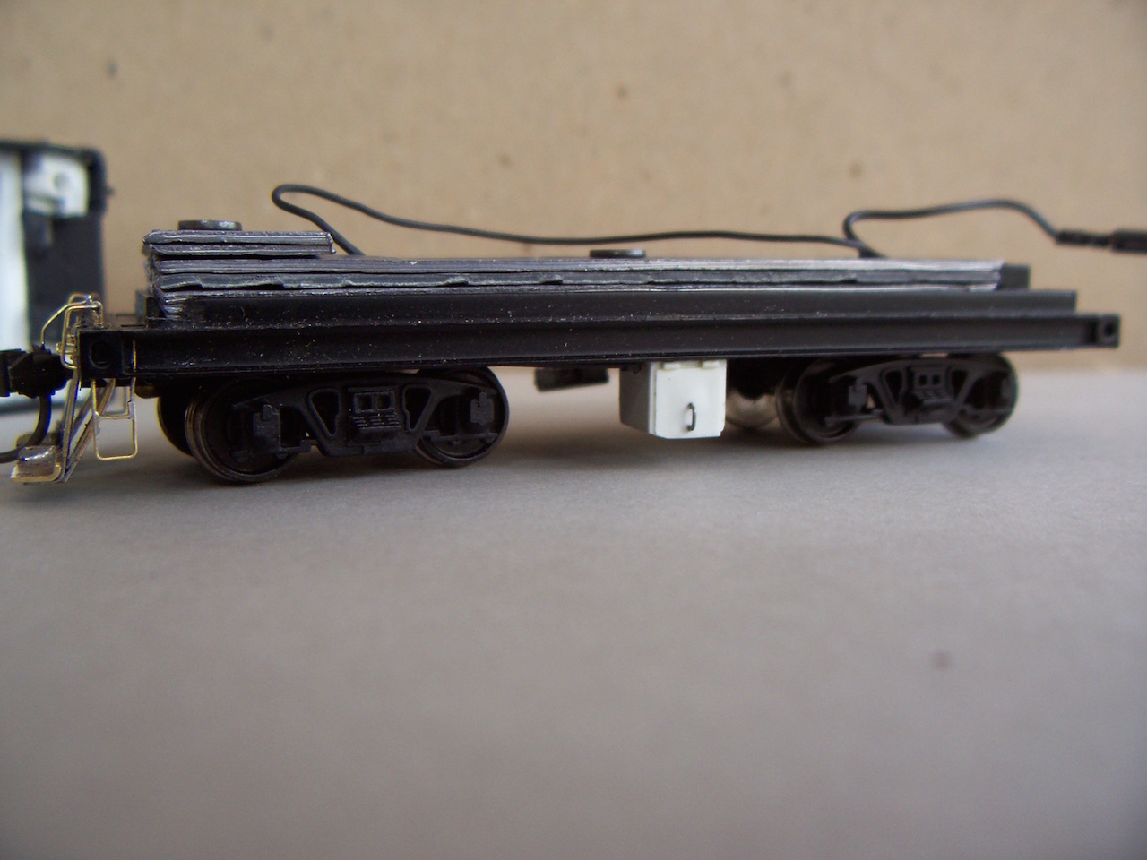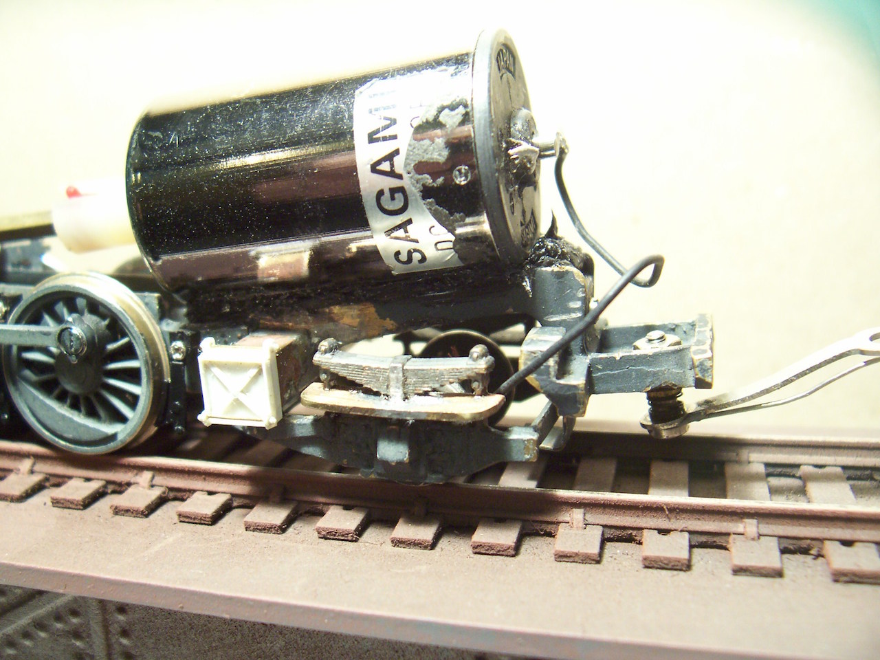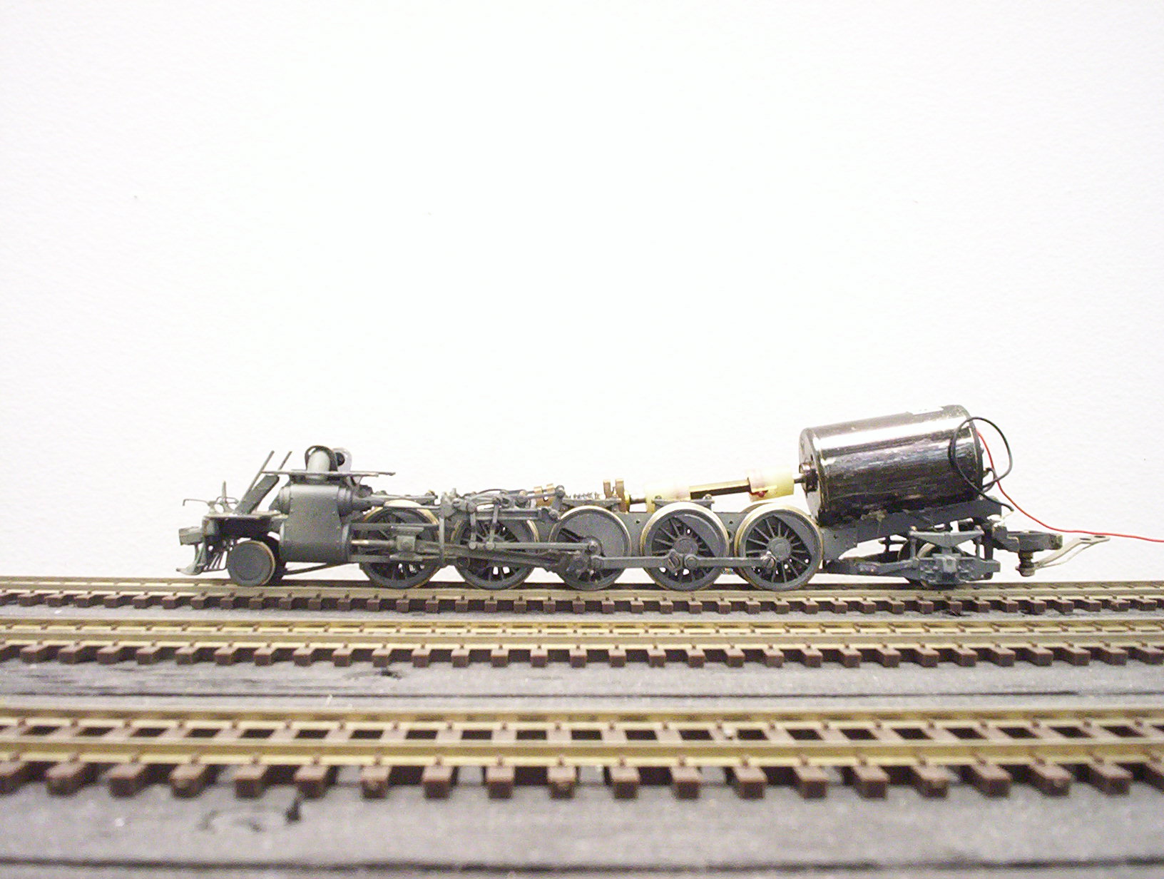 This is the Bachmann underframe for the tender.  The circuit board has been removed (I simplified the original wiring for DC operation) and removed the stock steel weight, replacing it with sheets of lead.  The small toolbox has been added, along with a re-railing frog on the other side...
