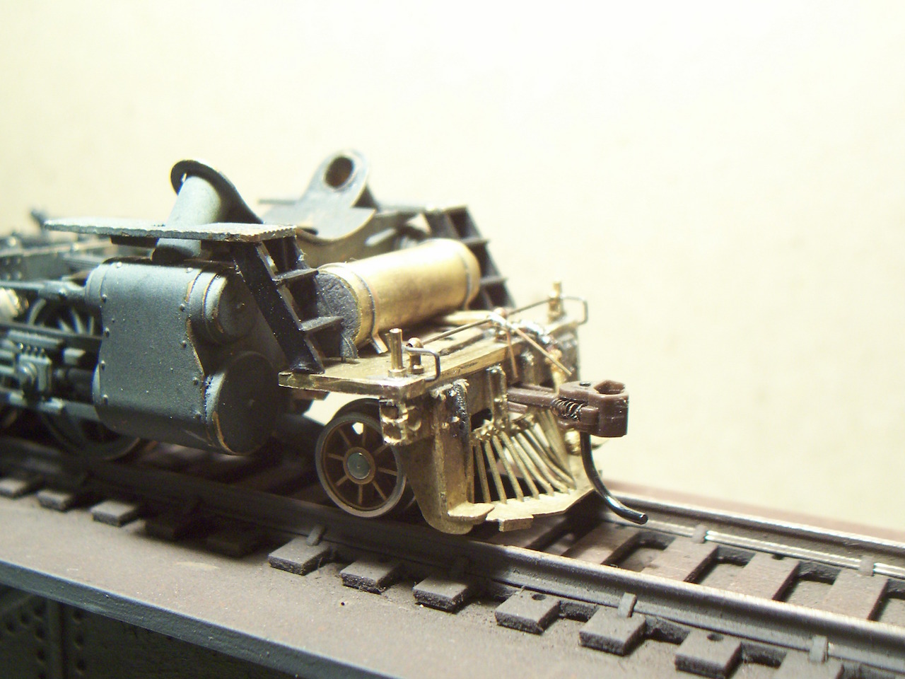 I fabricated a new pilot deck, altered the frame, then modified a brass CNR-style pilot to accommodate a Kadee coupler. (Mister Nutbar had bought a number of these from a brass importer some years ago - this is the last one that we have.)  Everything was soldered together using a 200 watt iron, then the coupler lift bar and stanchions, flag holders and a new air tank (built from lead-filled brass tubing, with .010”x.030” brass strip used for tank bands) were soldered to the assembly.