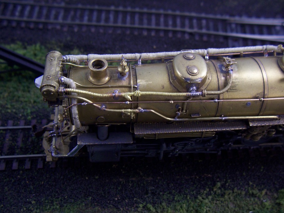 On the same side, but farther forward, you can see the top feed check valve, sander pipe and valves for the forward sandbox, and the lagged steam pipe from the dome forward to the smokebox front.  The new air tank is another fabricated from lead-filled brass tubing.