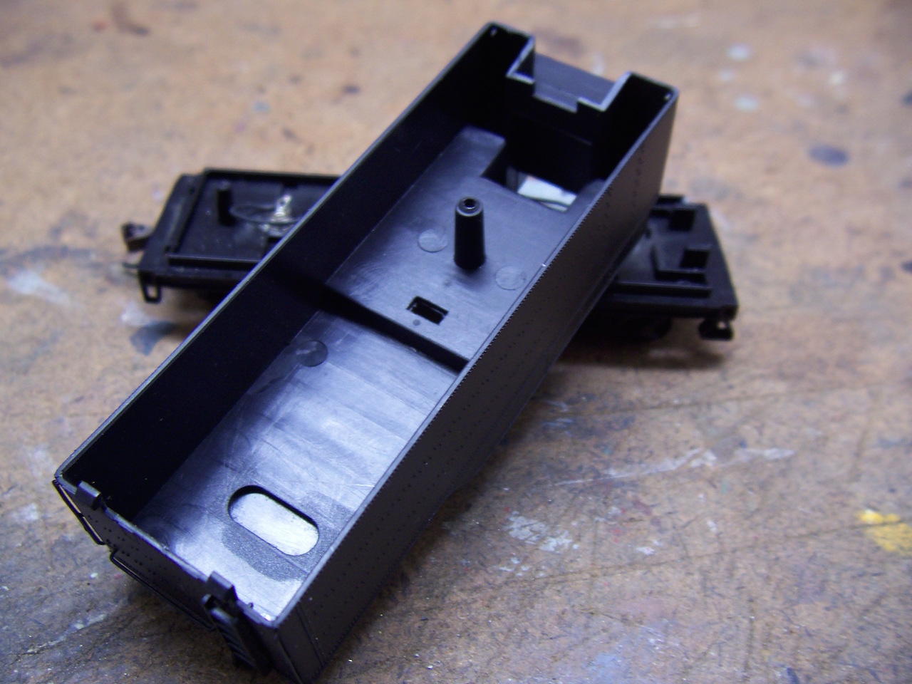 Because of the modifications made, I had to remove the original single-screw set-up for attaching the tender to its frame and running gear, so I added some styrene tubing in the water legs of the tender's cistern.  Screws through the floor of the tender and into that tubing will keep the whole shebang together...