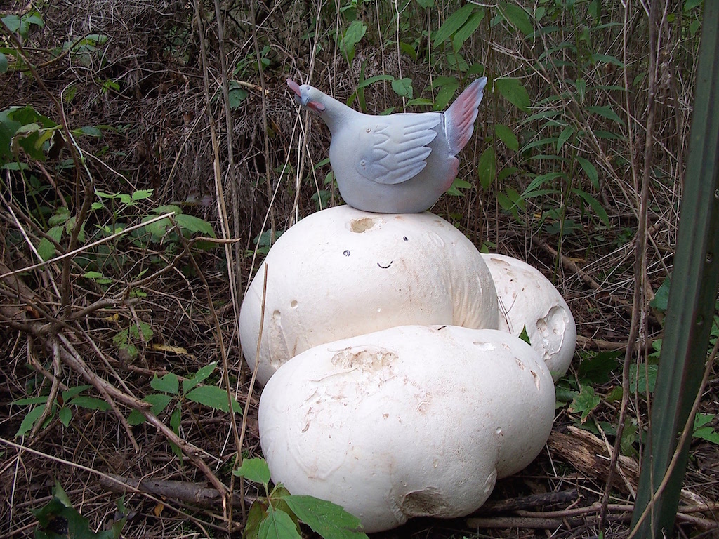 Nothing to do with trains, but I found this apparently confused chicken attempting to hatch these mushrooms...