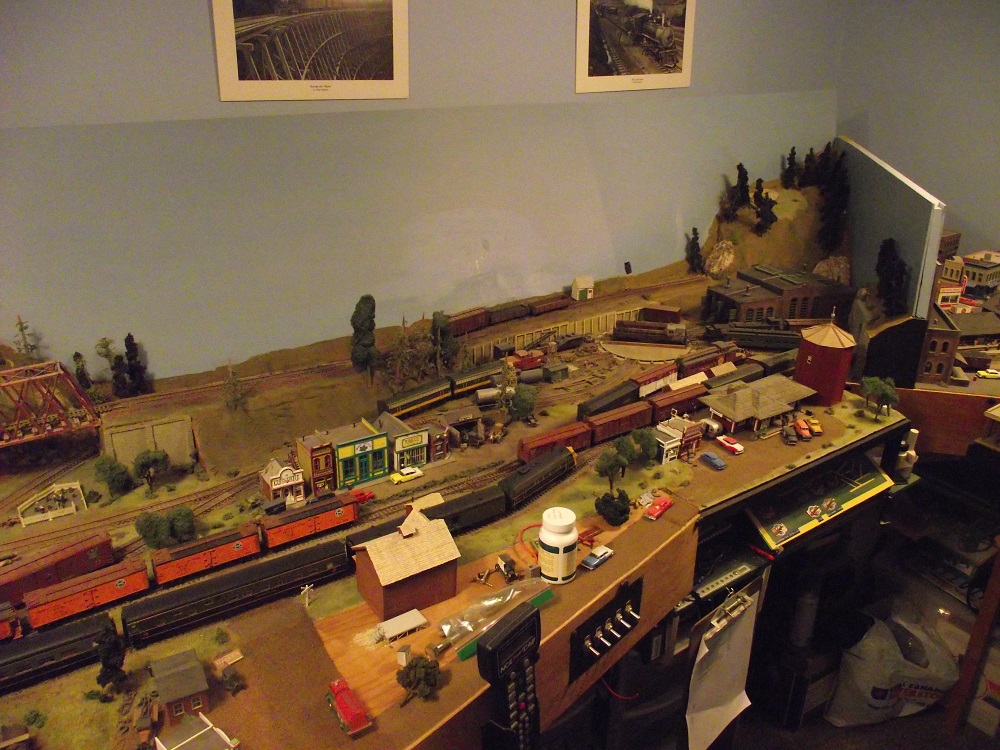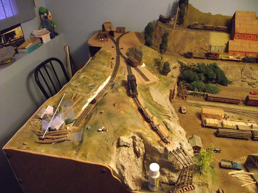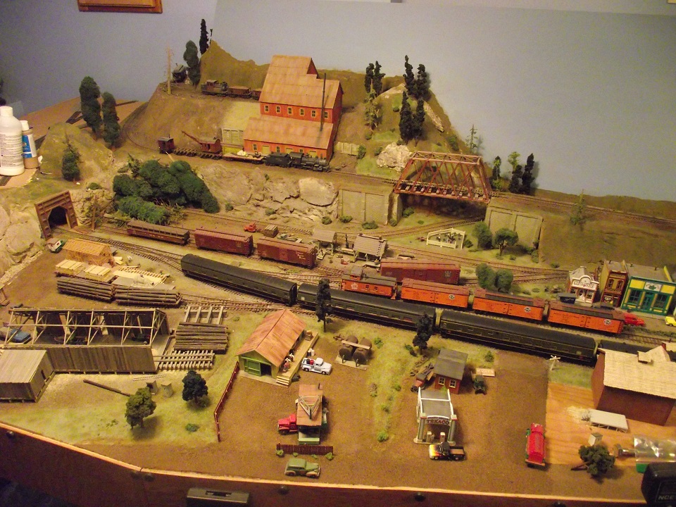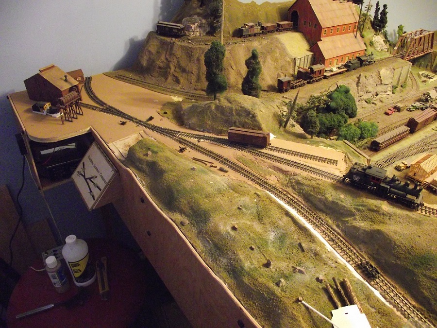The other part of the rural area. you can see my stamp mill in the background. It's accessed by a switchback along the rear of the scene. This is one thing I'd like to remove with a single incline to the mill. In the foreground is the very small yard that holds only 5 cars and my sawmill.