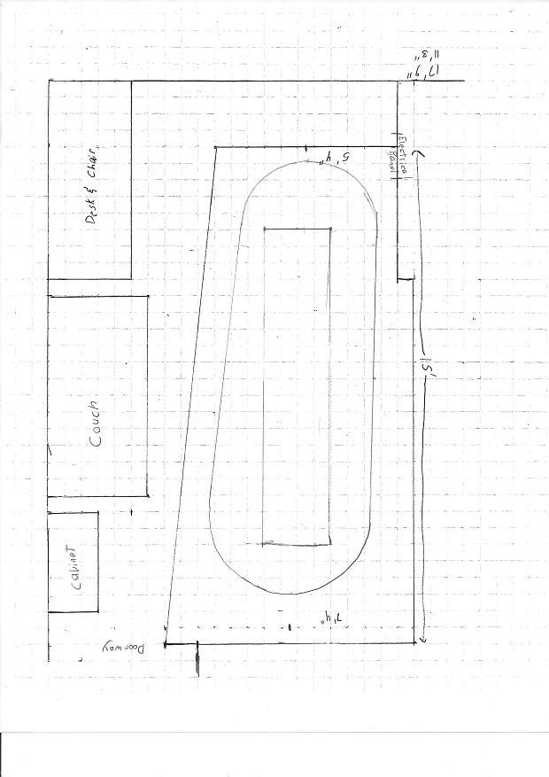 The new layout has pretty much the same footprint as the original, with the exception that the one side is now a straight line. My plan is to have a 2' aisle inside and probably a lift gate to access it. The new mainline radii would be 24 and 30". I'll probably move the loop closer to the couch side so I can have room for a incline to the stamp mill and logging area.