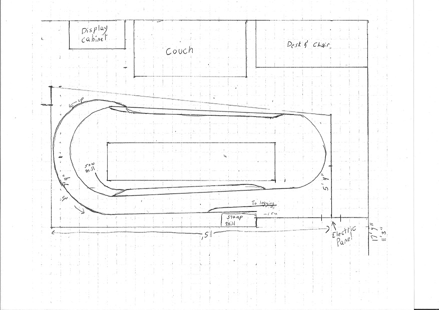 I moved the loop closer to the couch side as I mentioned, still keeping the 30 and 24" radius curves. I also added the incline spur that will serve both the stamp mill and the logging area, but adding a turnout so the stamp mill will have it's own siding. I also added passing sidings to both longer legs, each about 8 feet long if my measurements are correct.