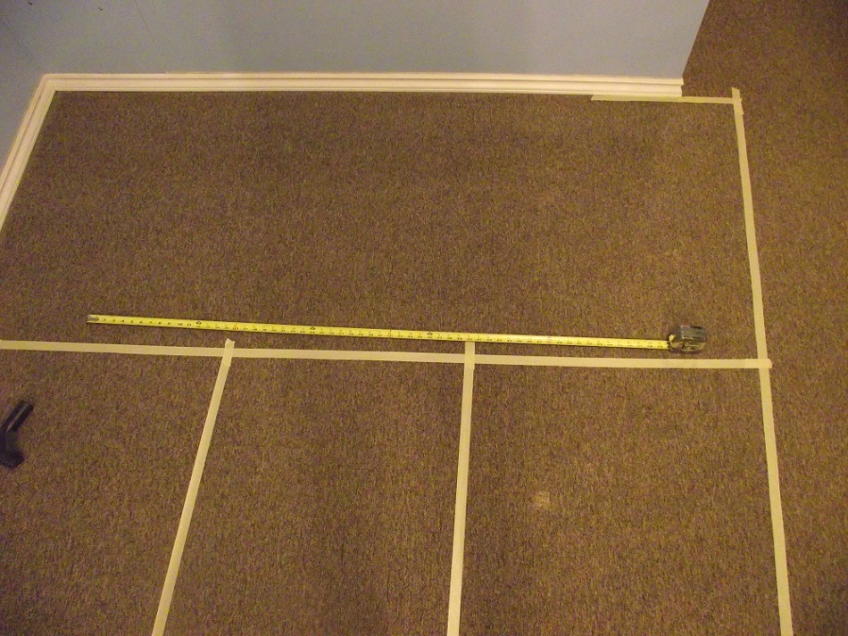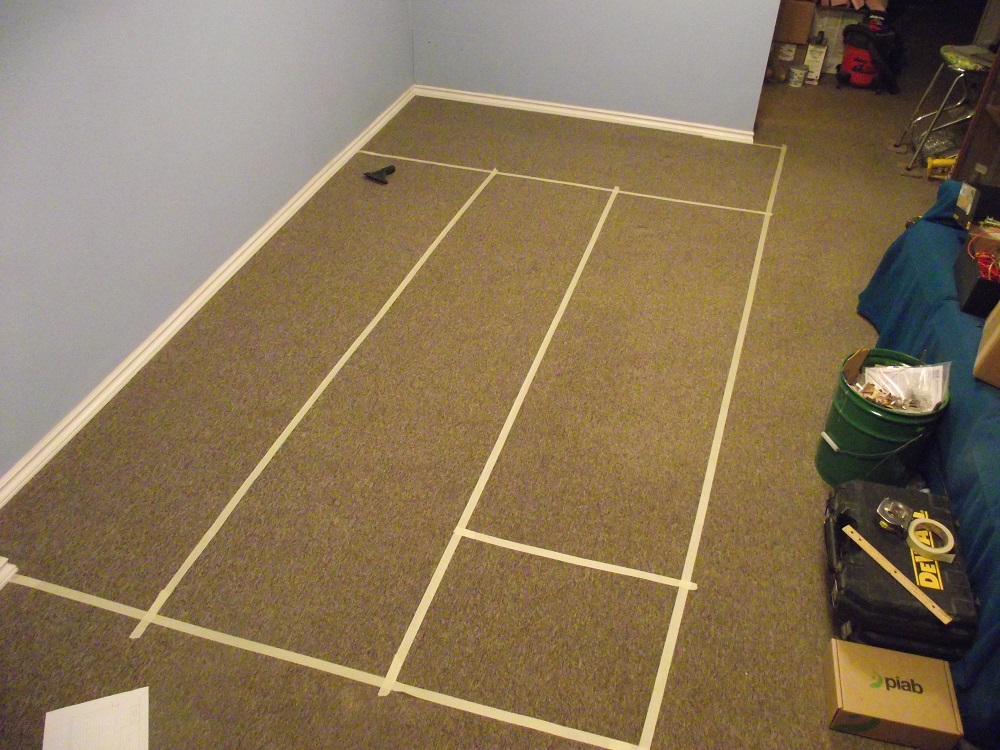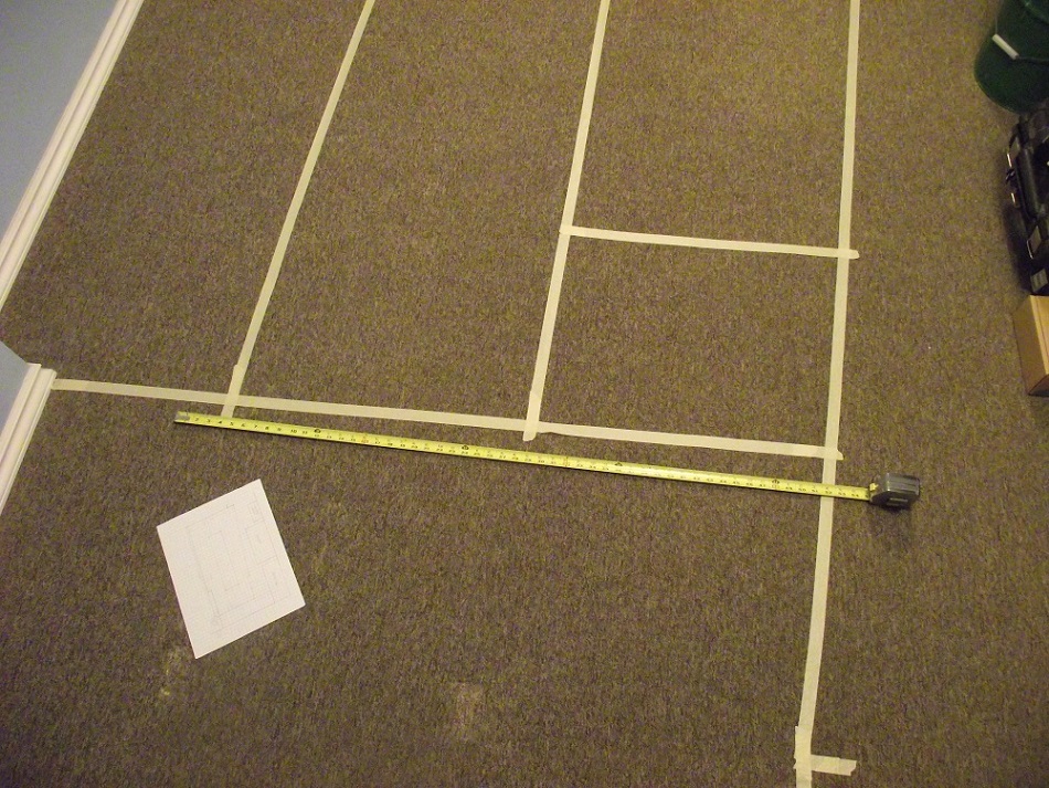 Then After a through cleaning of the room with both the shop-vac and our good vacuum cleaner, I decided to lay out the footprint of the new layout with masking tape. The far end in the photo shows the 5X4' section that will have the narrow gauge section re-attached. I allowed for a 2' wide operator 'pit' in the center with the hinged drop down marked out to the side.