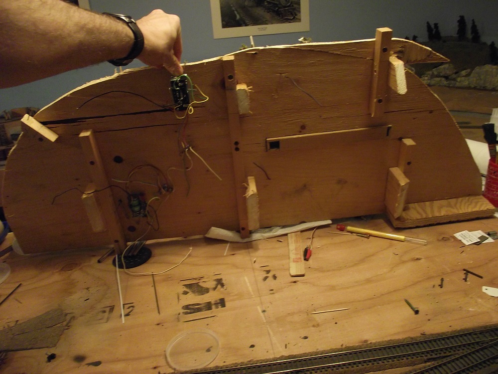 This is the bottom of the diorama. I plan to remove the wiring and switch machines as they won't be needed anymore. I'll also remove the remains of the framework so I can attach the 42x16" piece of plywood. I will have to cut a relief in the board for the engine house inspection pit that you can see towards the right.