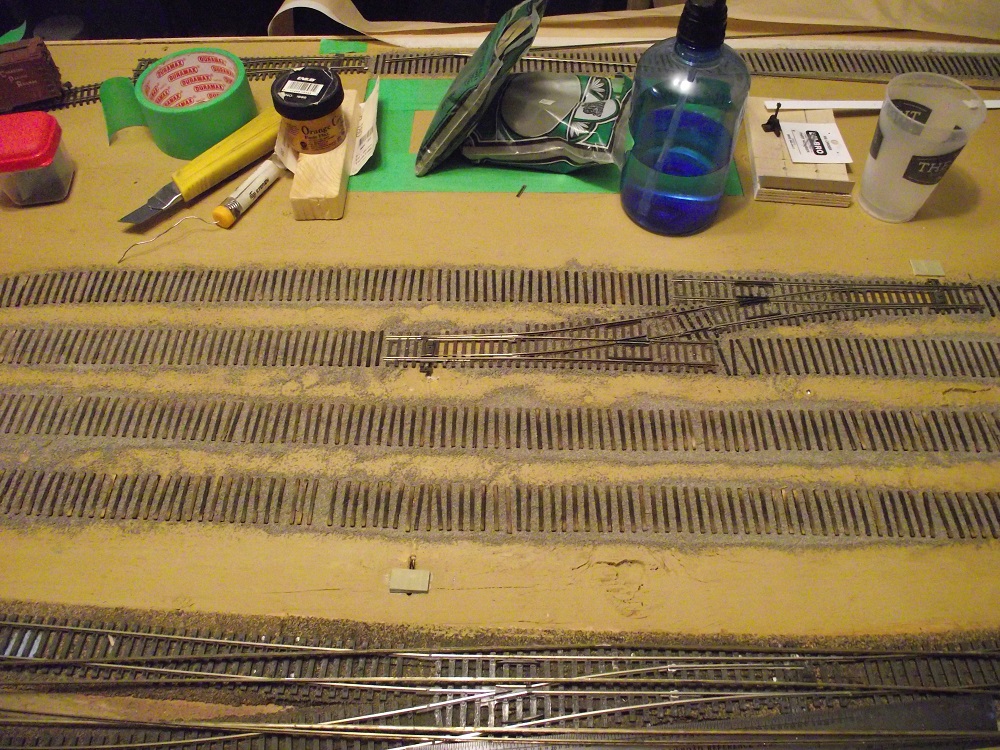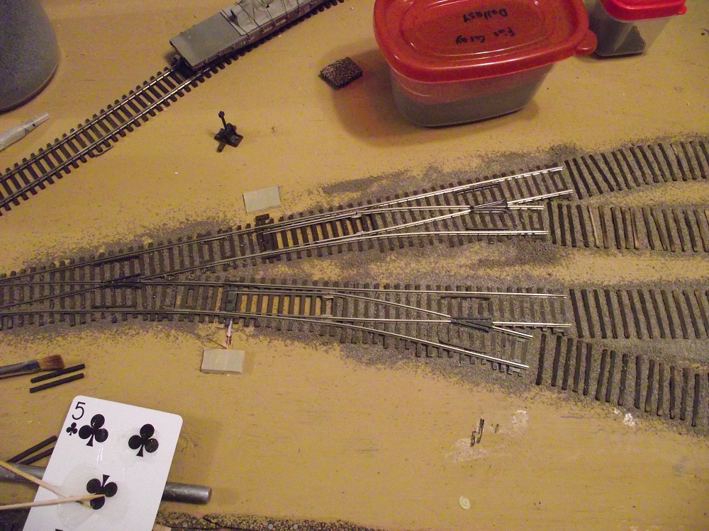 I also ballasted around some of the turnouts, but not around the points. Still figuring that out. These still have to be cleaned up around the rails, frogs, and tops of the ties.